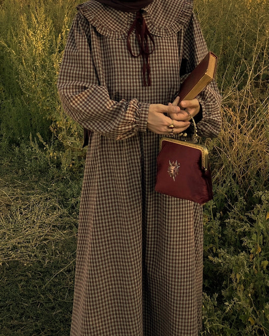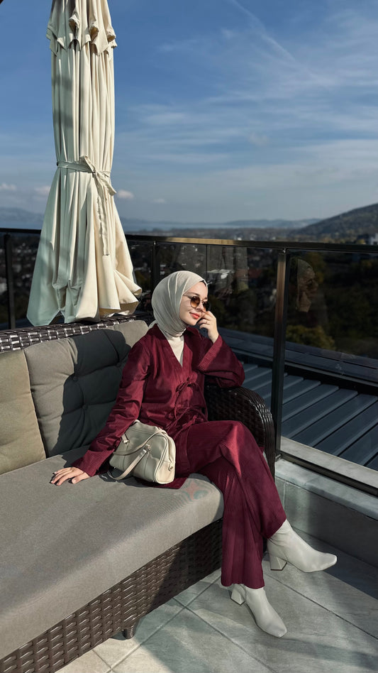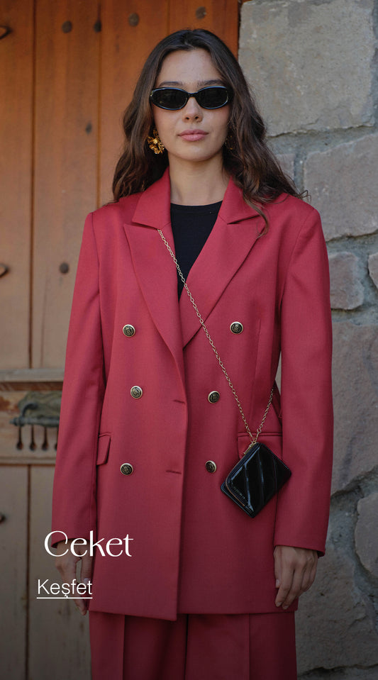 Ekose Bordo Keten Ceket Etek Takım - Fatma Atasoy