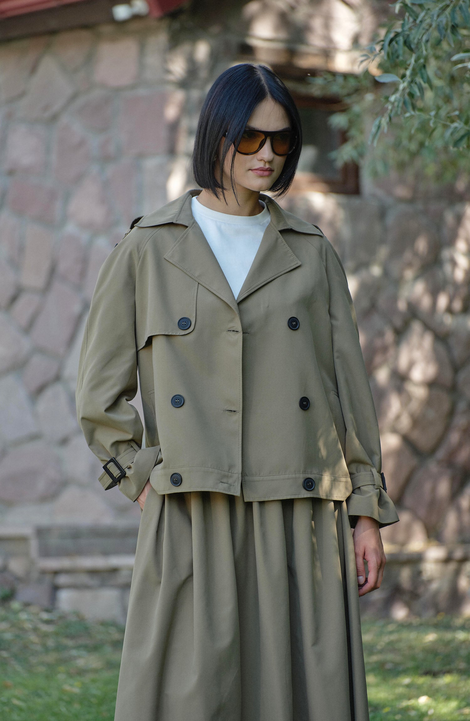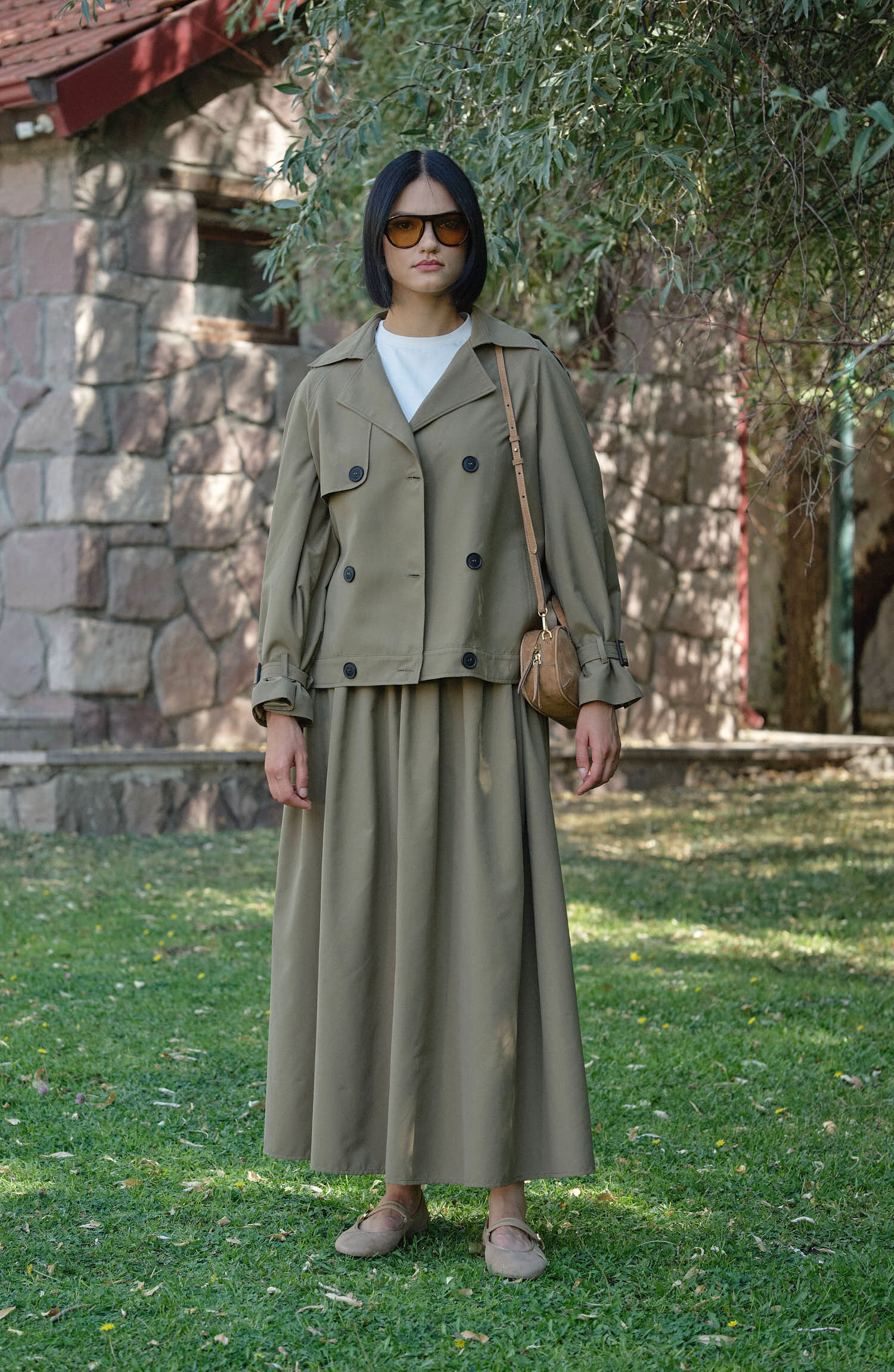 Kullanım Önerileri: Mevsimlik kullanıma uygun bu etek, gömlekler, trikolar veya basic bluzlarla kolayca kombinlenebilir. Günlük şıklığın yanı sıra ofis stiline de uyum sağlayan bu parça, trenç kumaşın zamansız havasıyla uzun süre gardırobunuzda yerini korur.