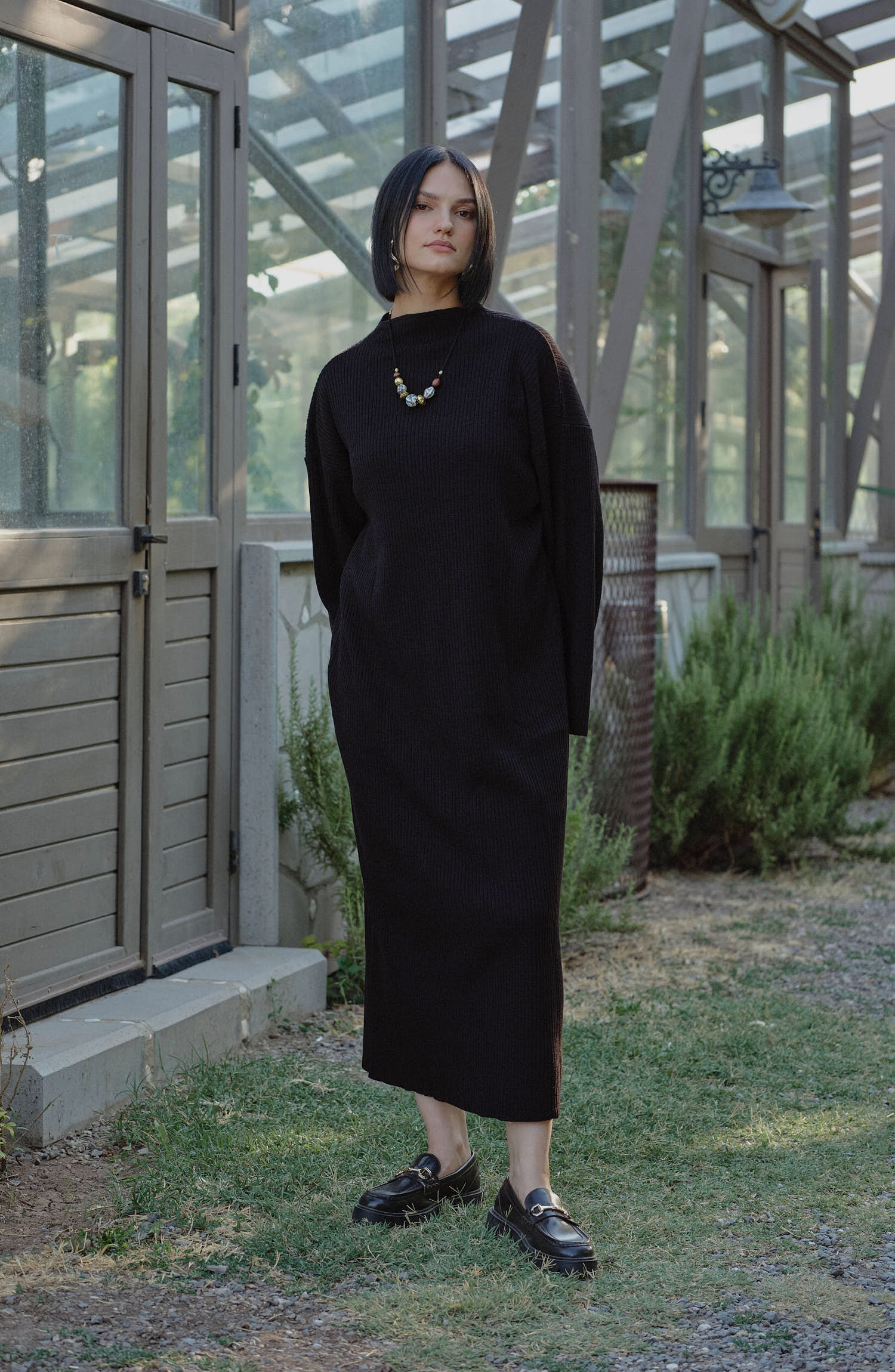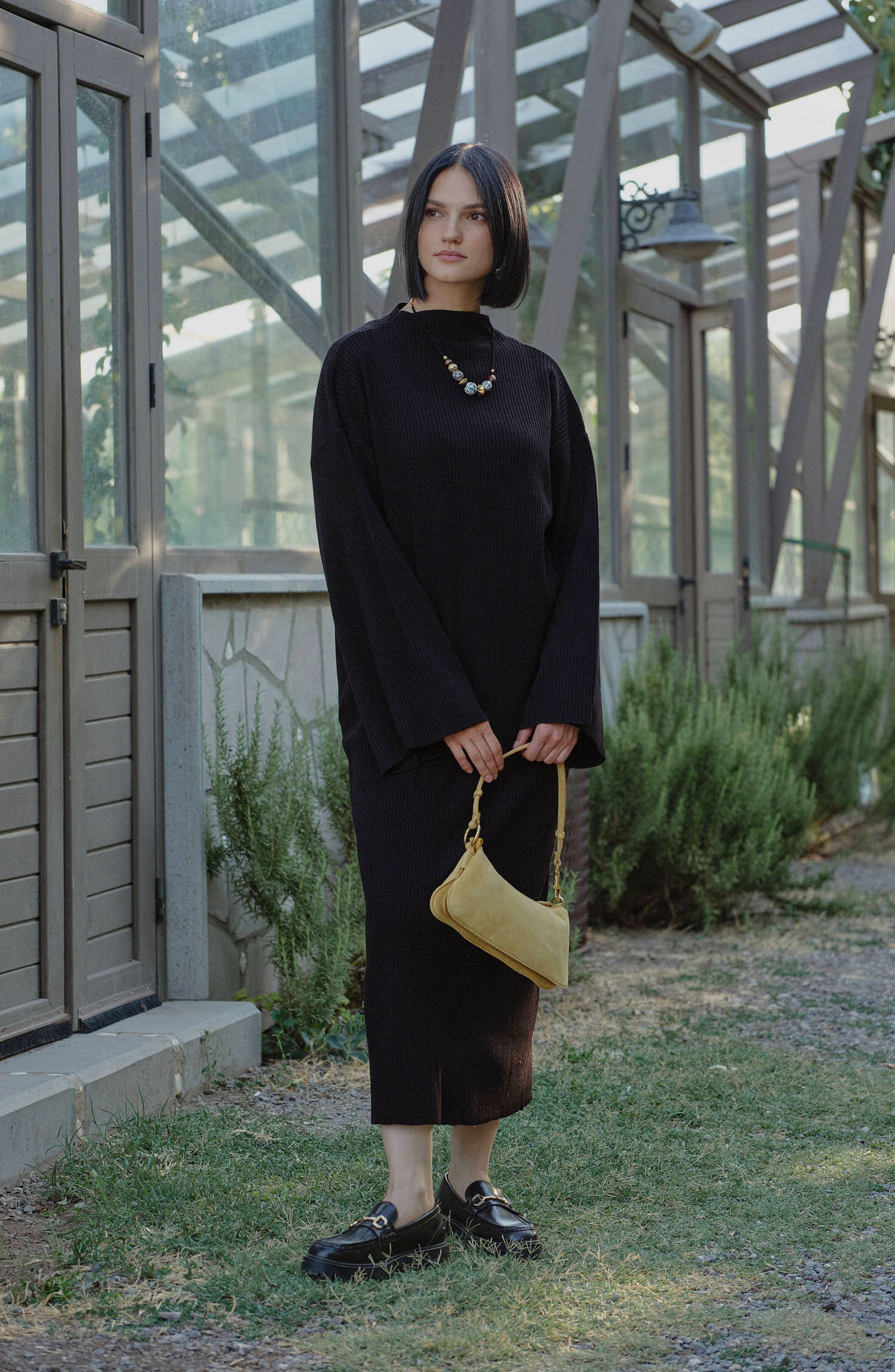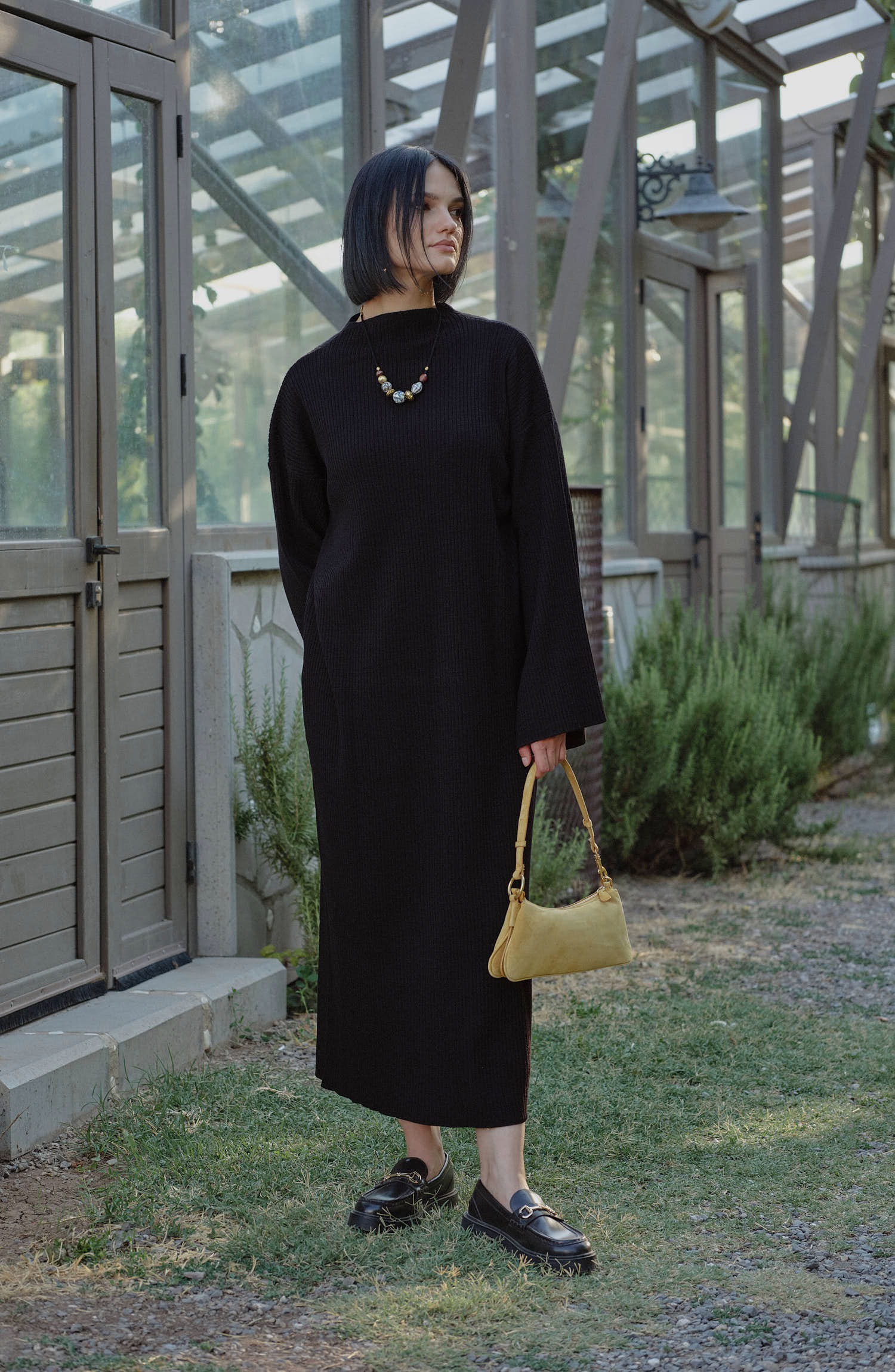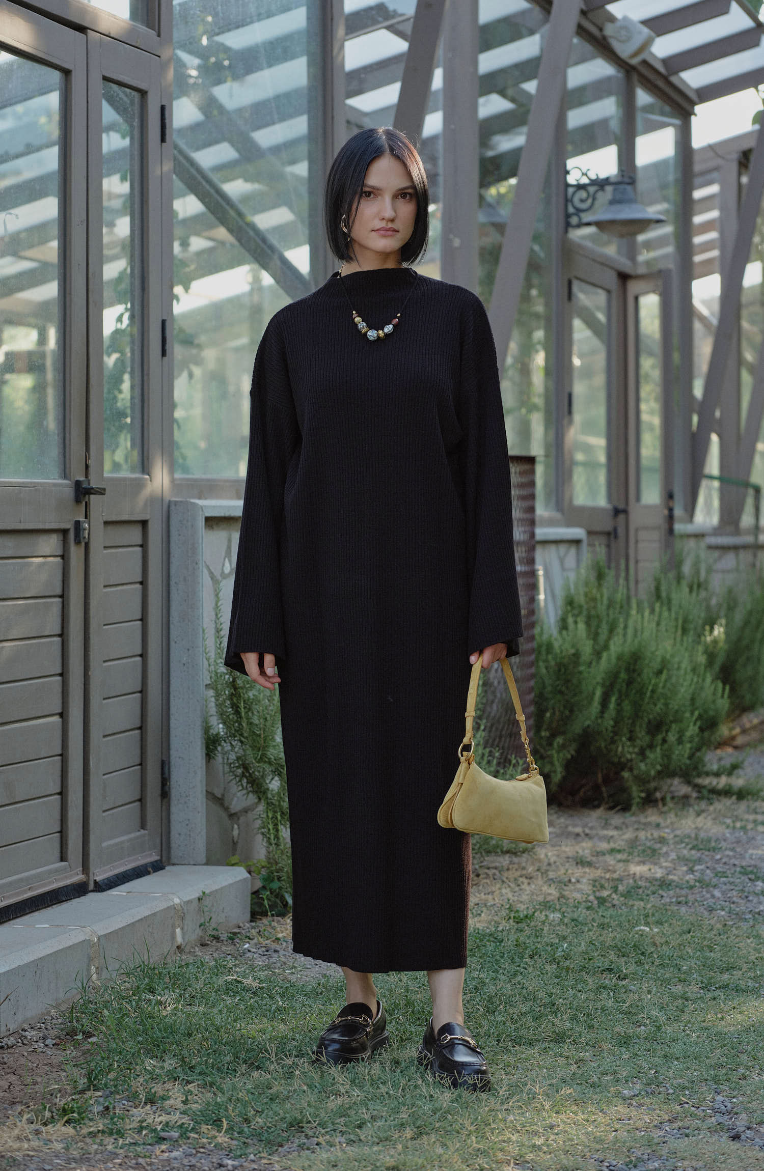 Geniş Kollu Fitilli Siyah Triko Elbise
