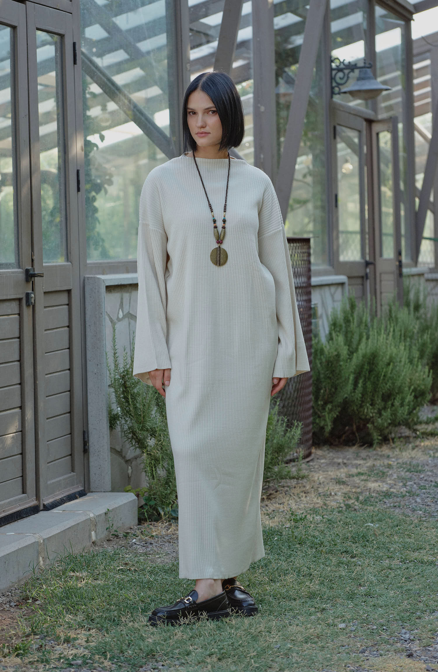 Geniş Kollu Fitilli Taş Triko Elbise