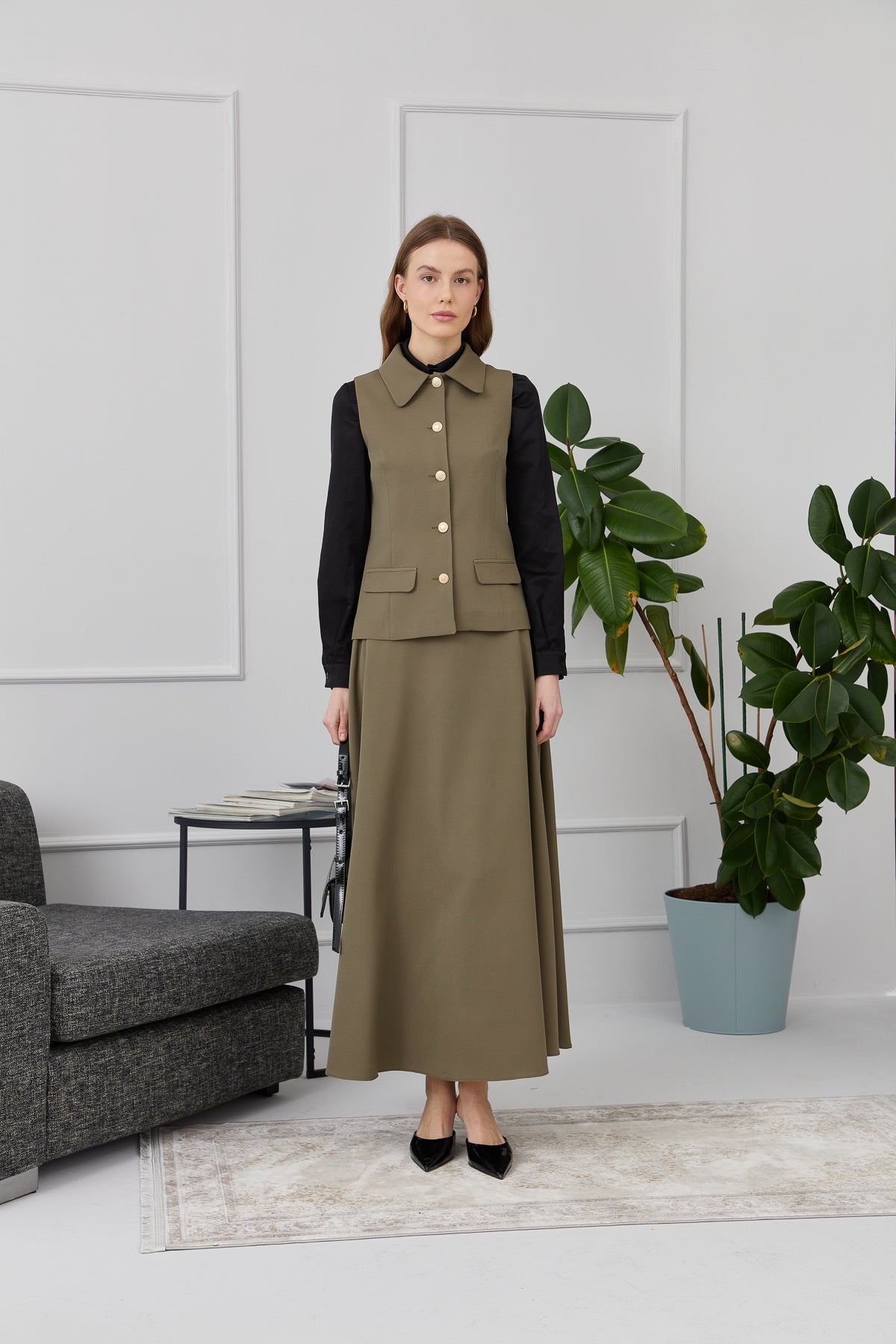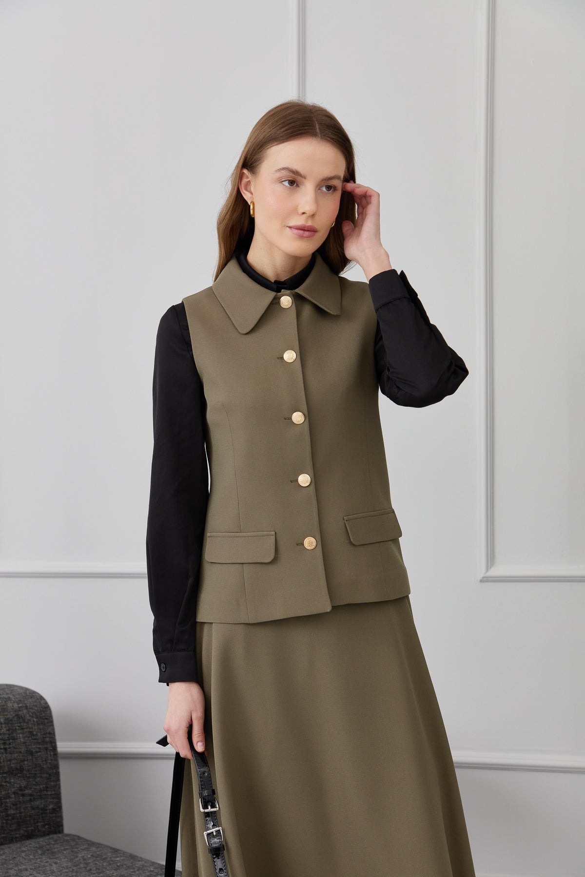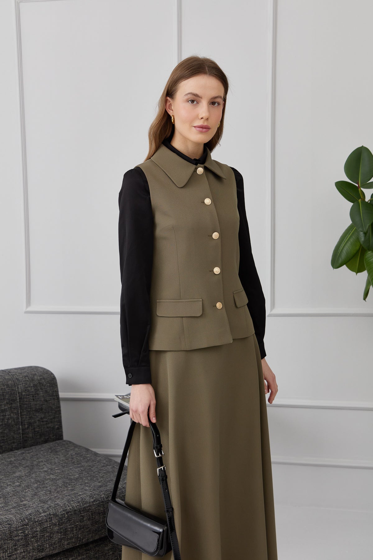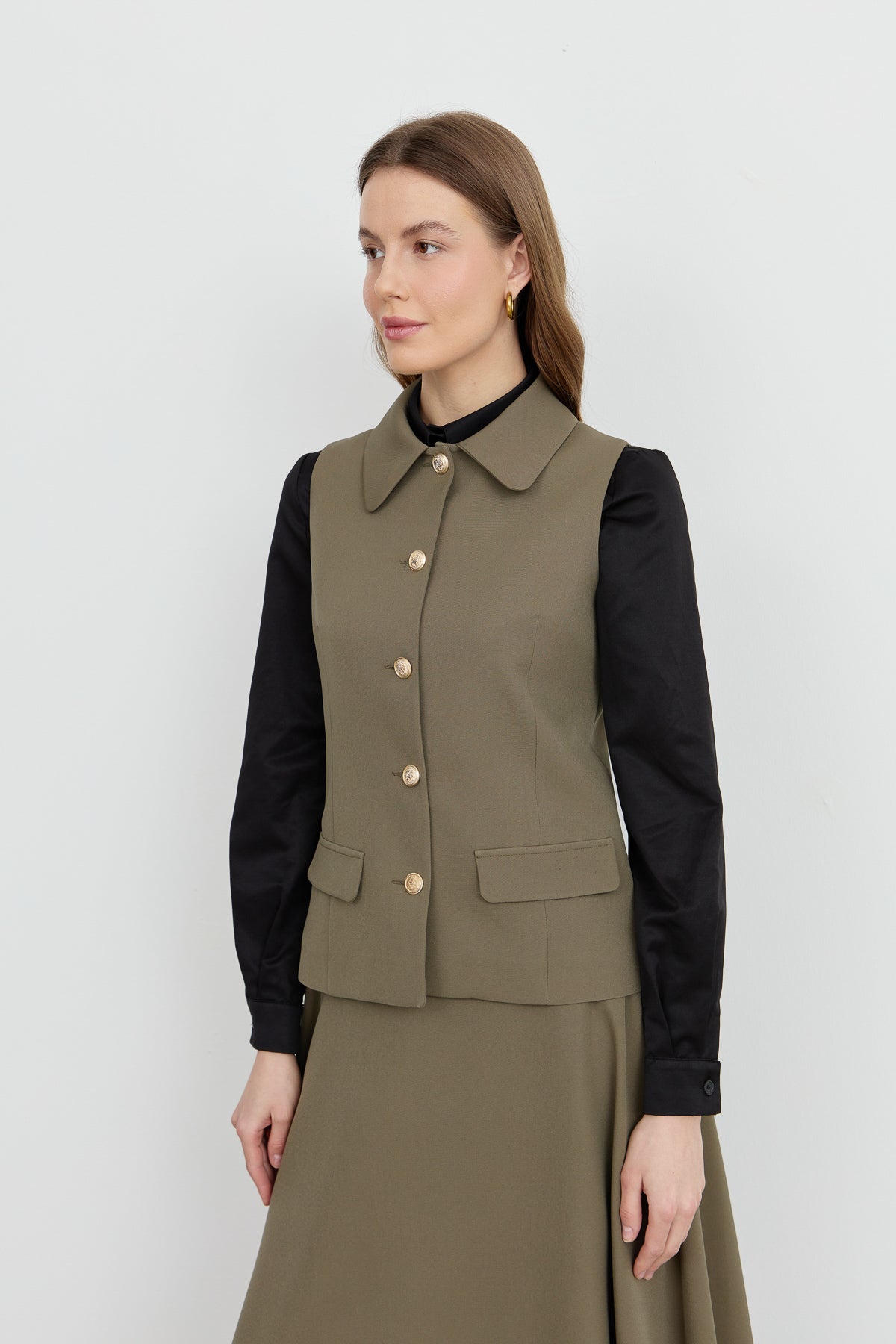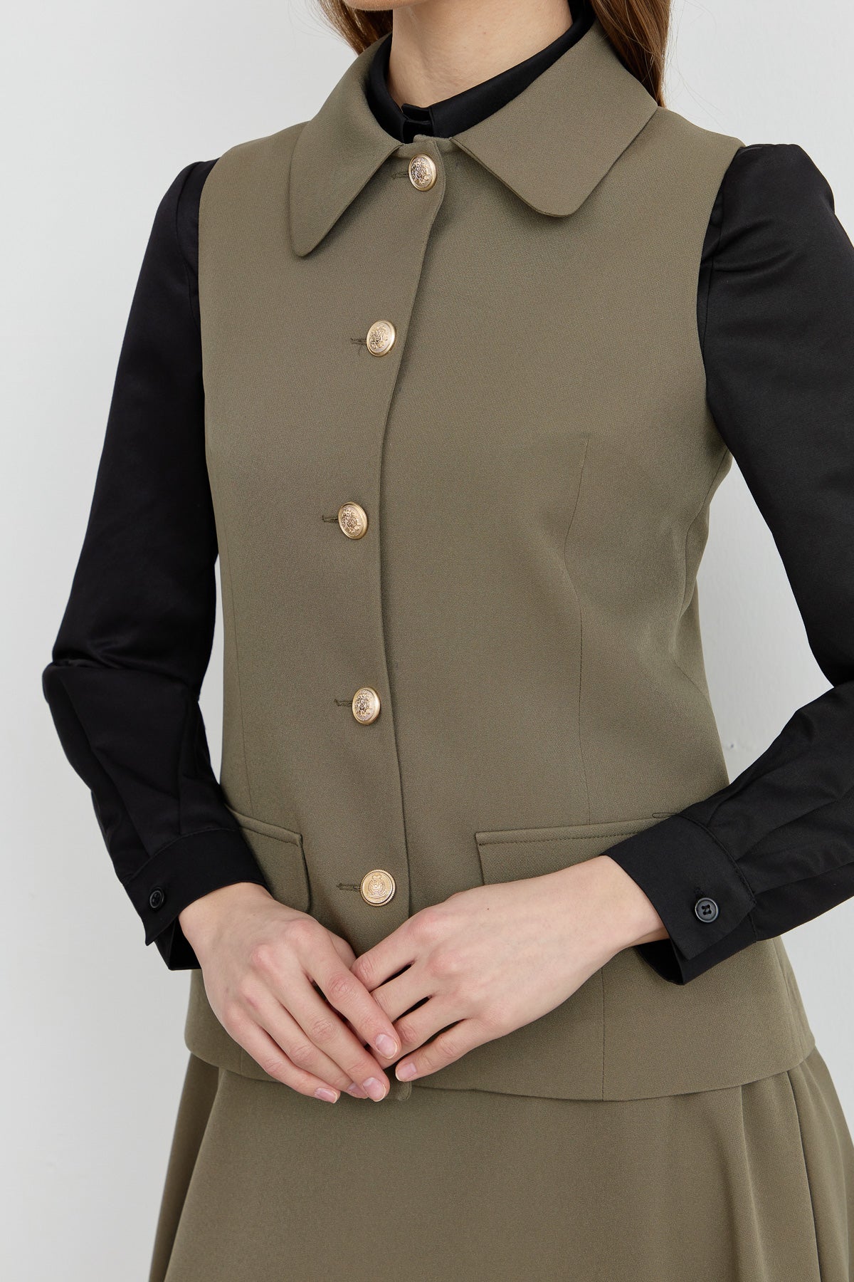 Tek Sıra Düğmeli Haki Kısa Yelek