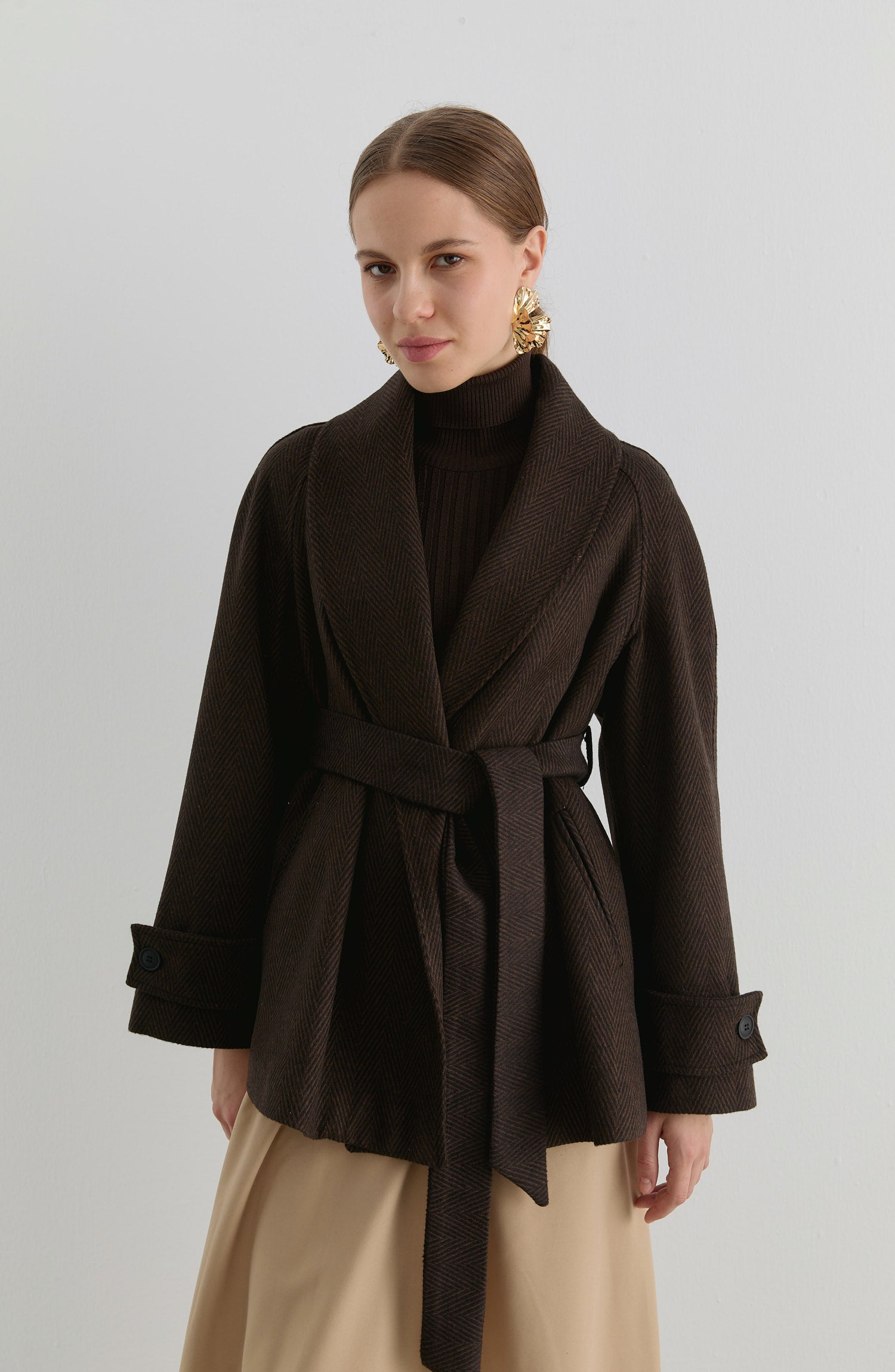 Kruvaze Taba Balıksırtı Midi Ceket Kaban