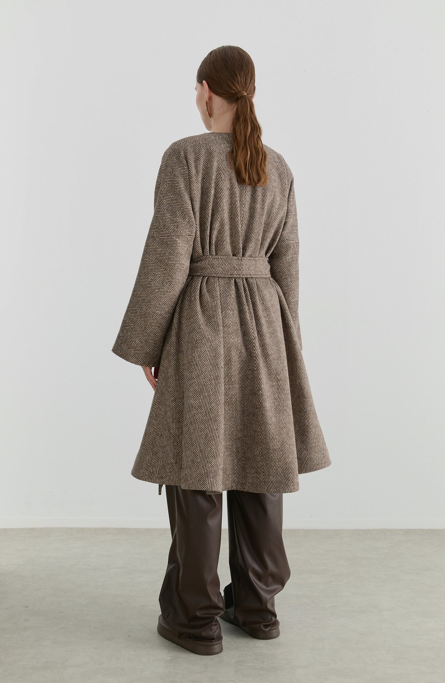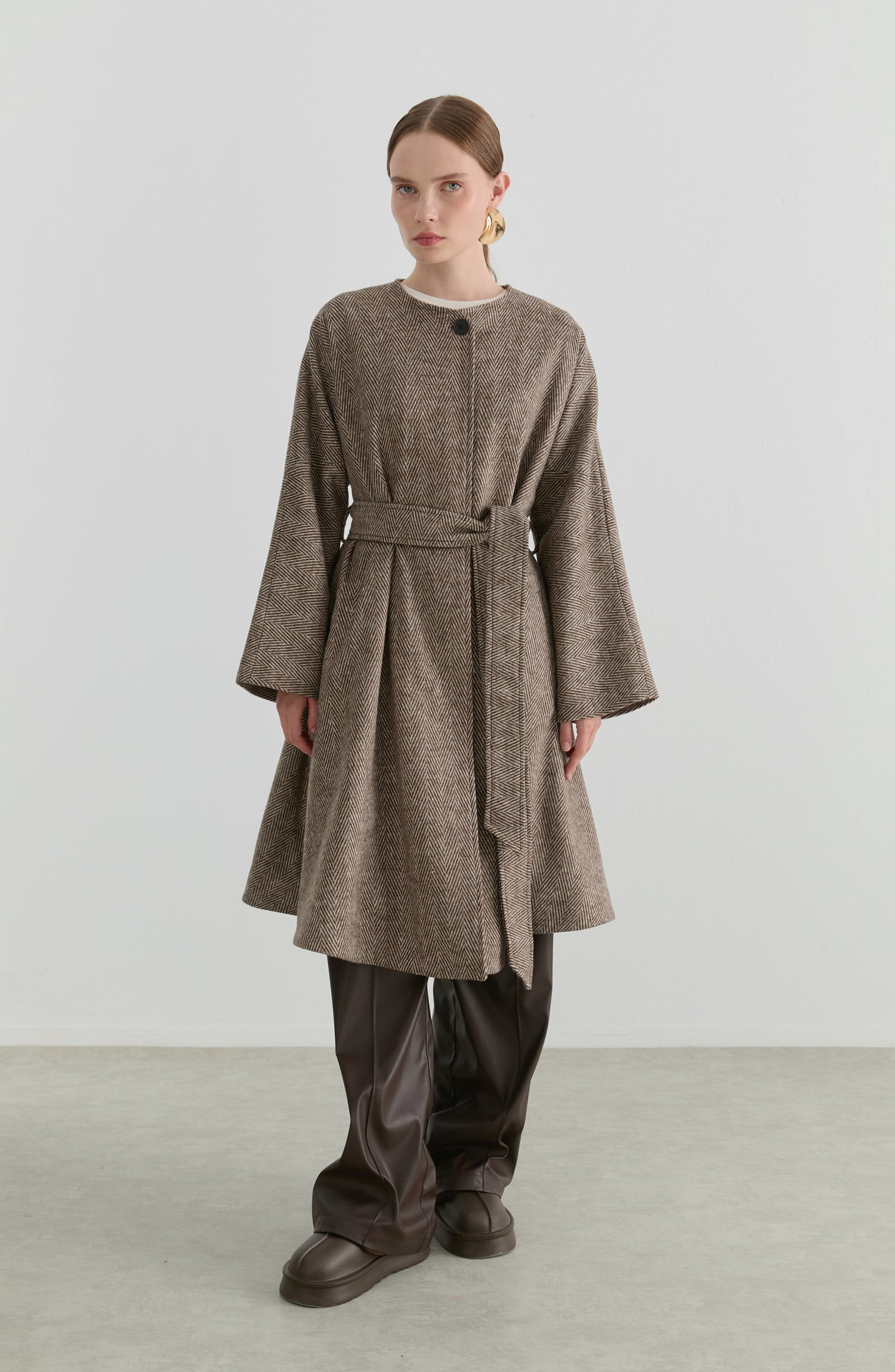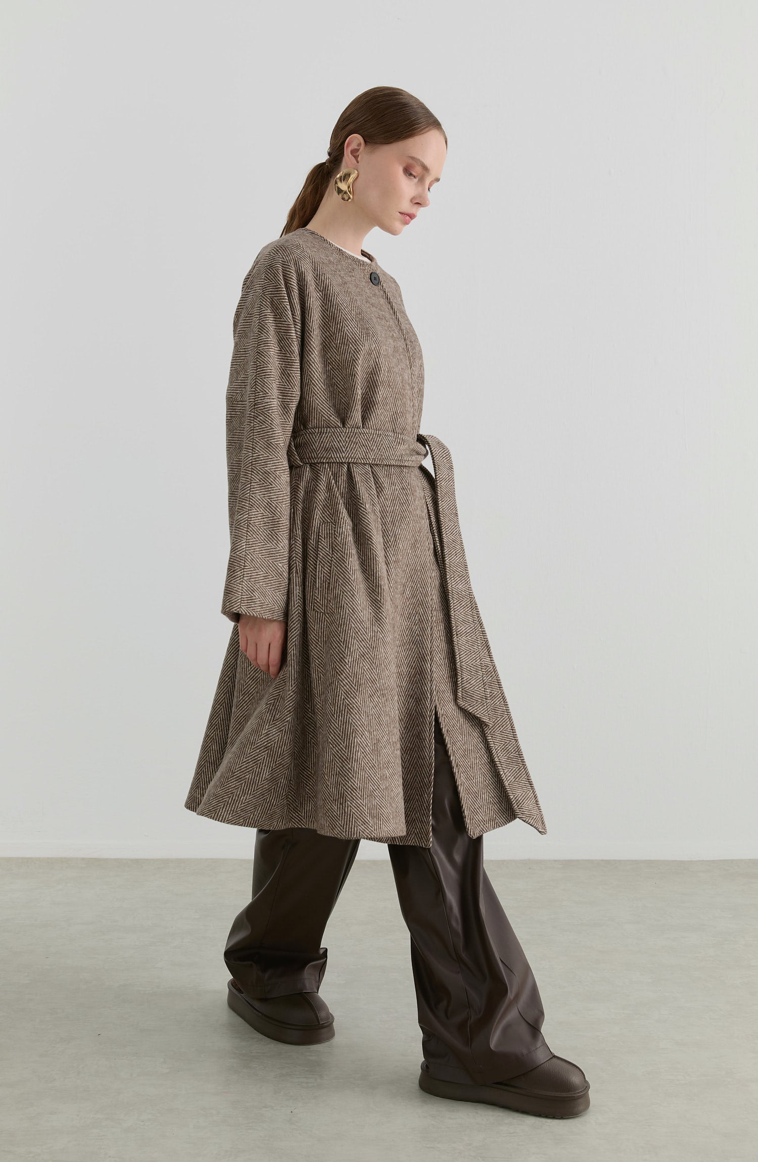 Pelerin Balıksırtı Sütlü Kahve Yün Kaban