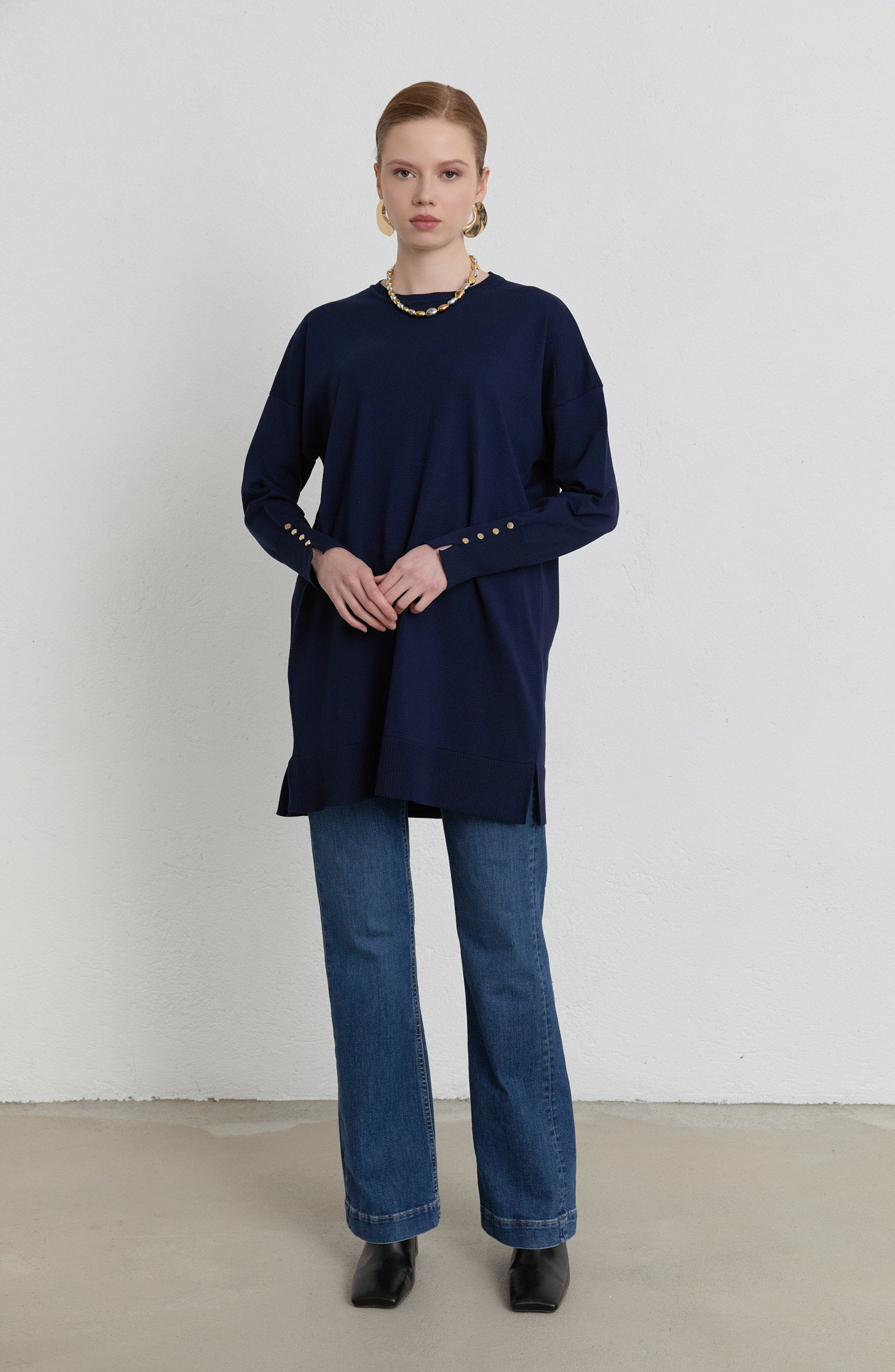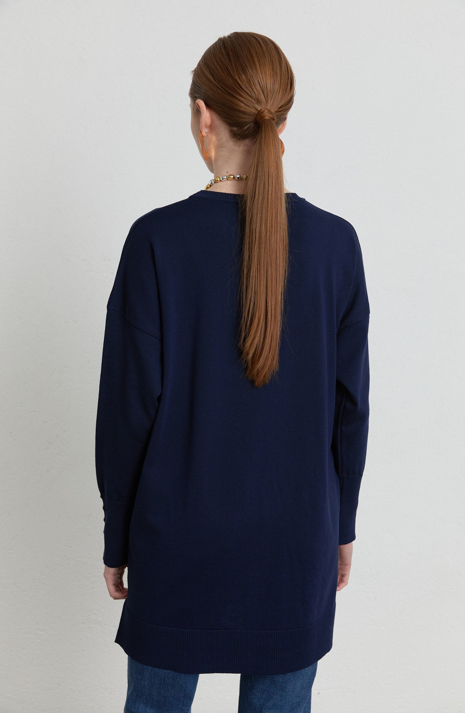 Gold Düğmeli Lacivert Basic Merserize Triko Kazak