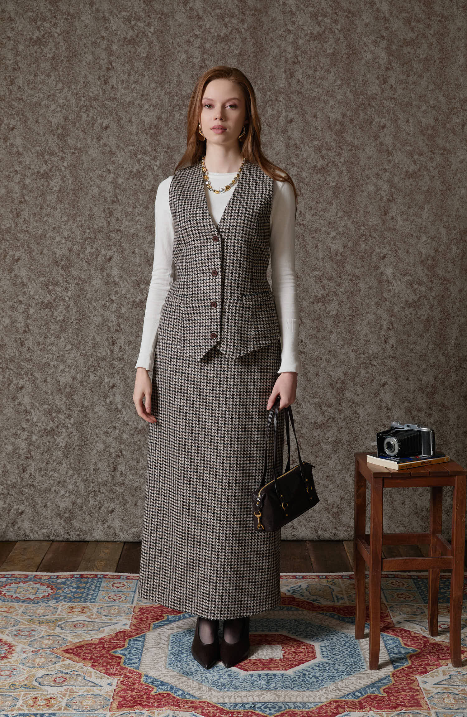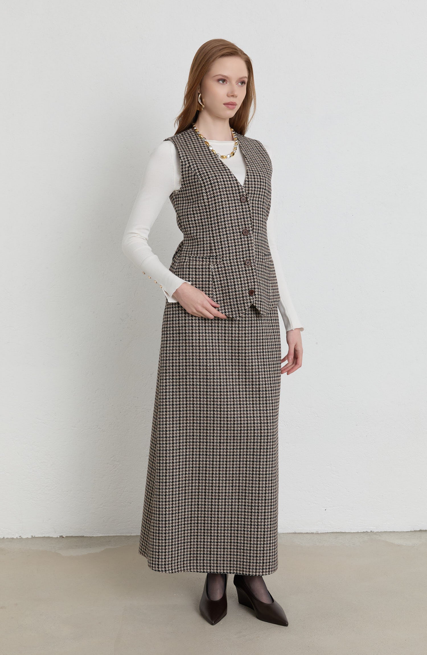 %50 Pamuk %50 Akrilik dokuma kaşe kumaş, doğal ve sentetik liflerin mükemmel birleşiminden oluşur. Pamuk, kumaşa yumuşaklık ve nefes alabilirlik kazandırırken, akrilik ise dayanıklılık ve ısı yalıtımı sağlar. Bu kumaş, genellikle kışlık montlar, kabanlar ve şallar gibi dış giyim ürünlerinde tercih edilir.Bu mevsimlik ve kışlık takım, V yaka ve tek sıra düğmeli yeleği ile zarif bir görünüm sunar. Ayarlanabilir bel kemeri rahatlık sağlarken, kalem etek modern bir tasarımla şıklığınızı tamamlar. Astarlı yapısı, soğuk günlerde ekstra konfor sunar.