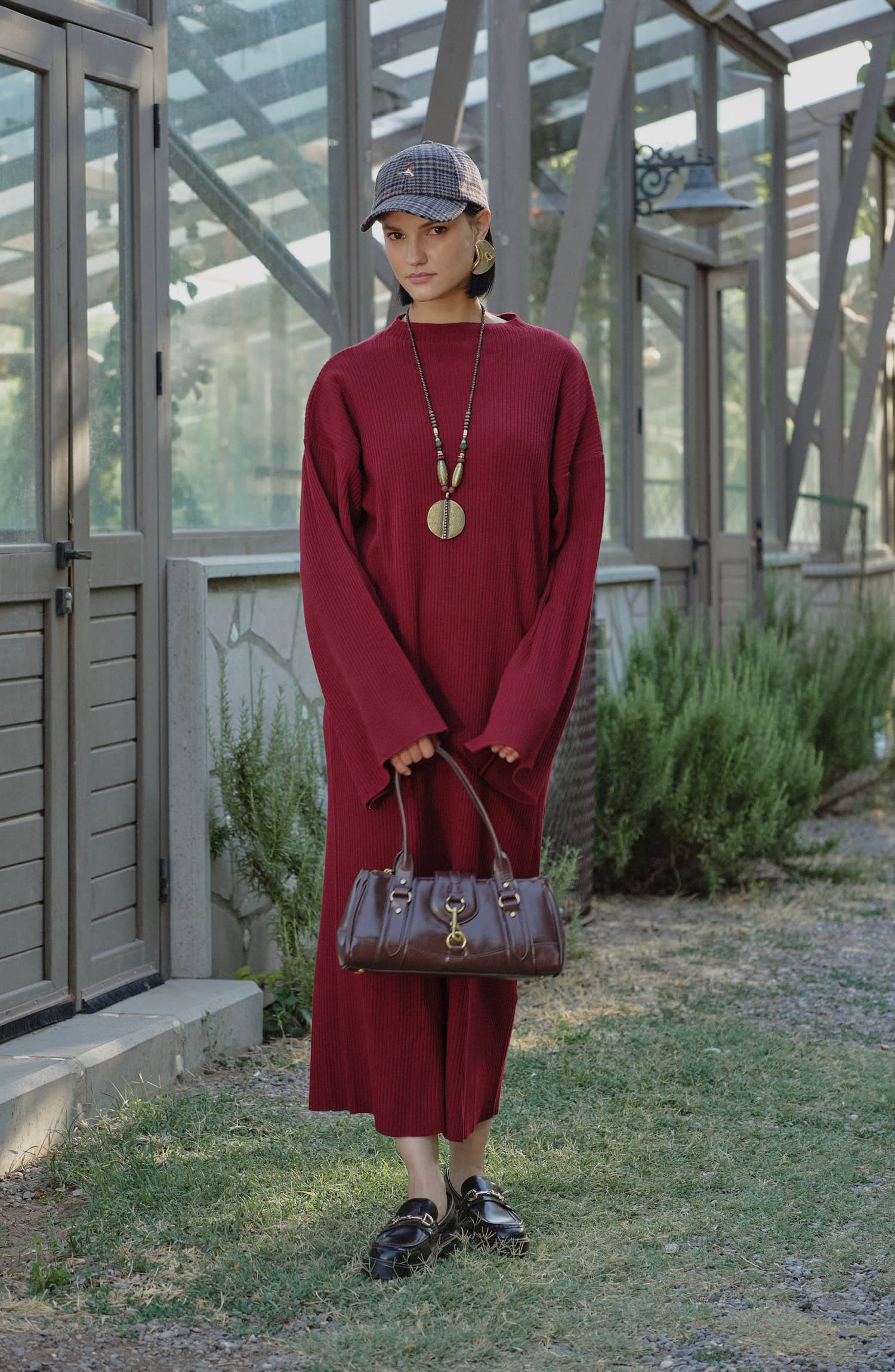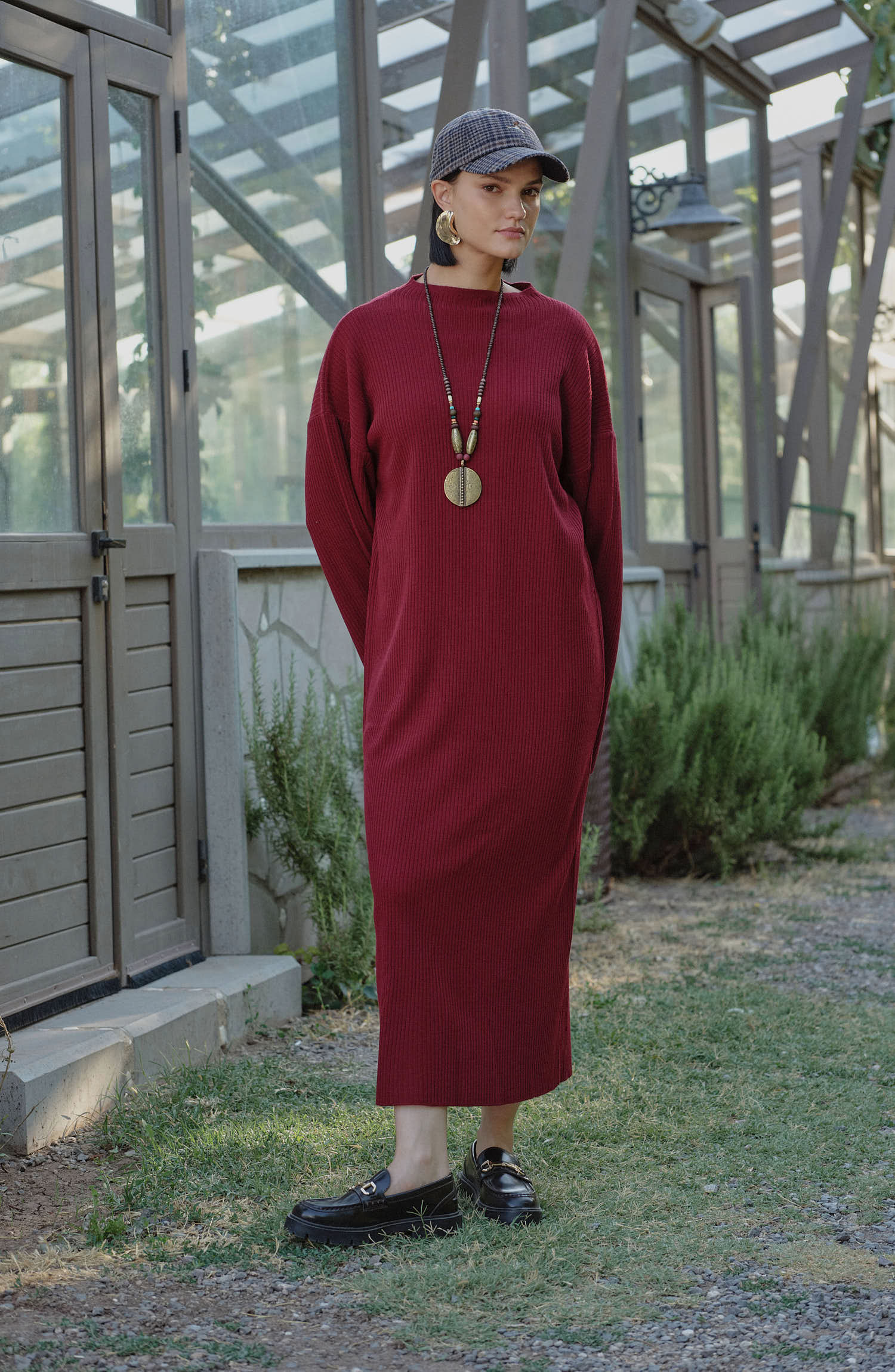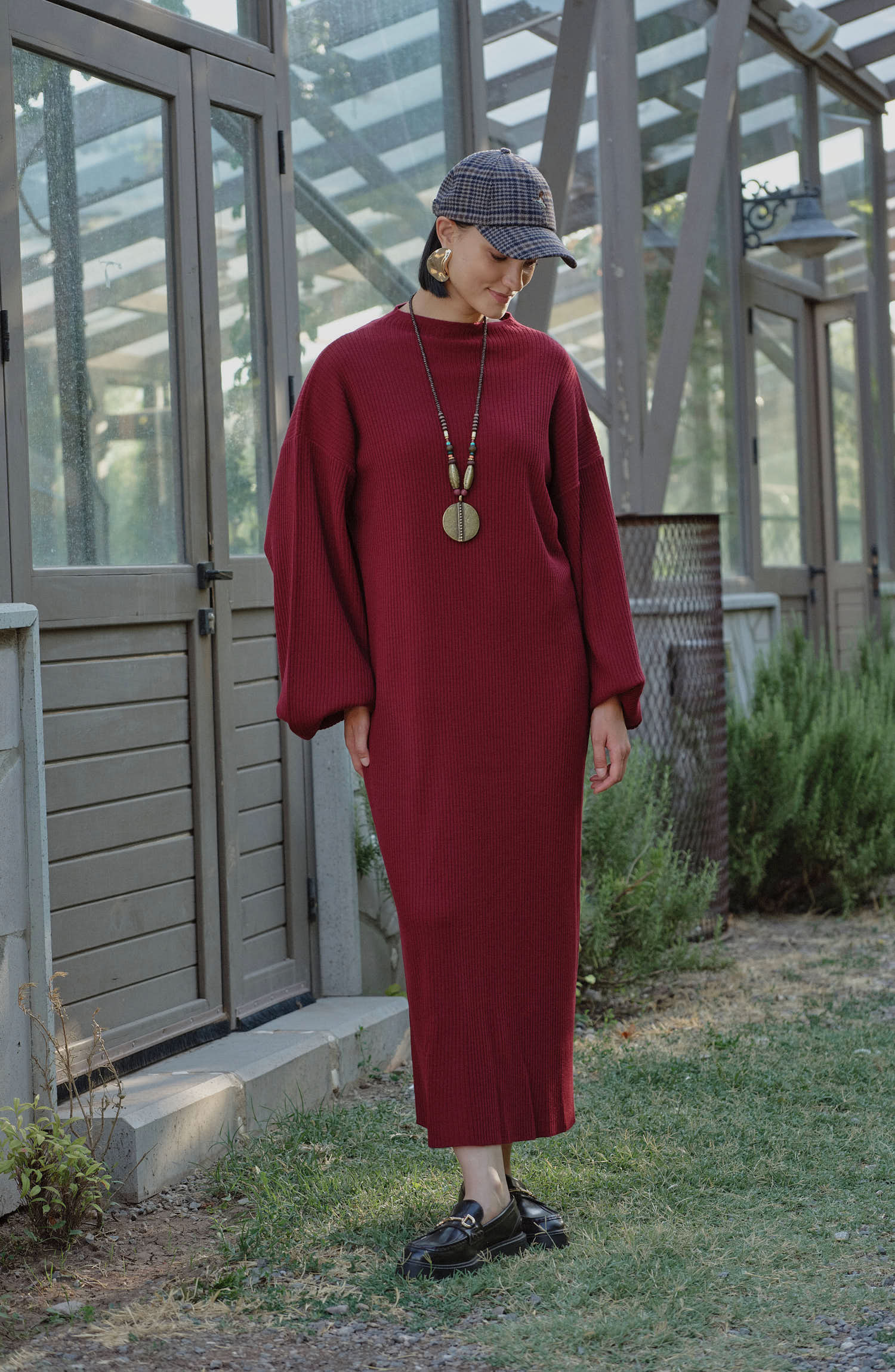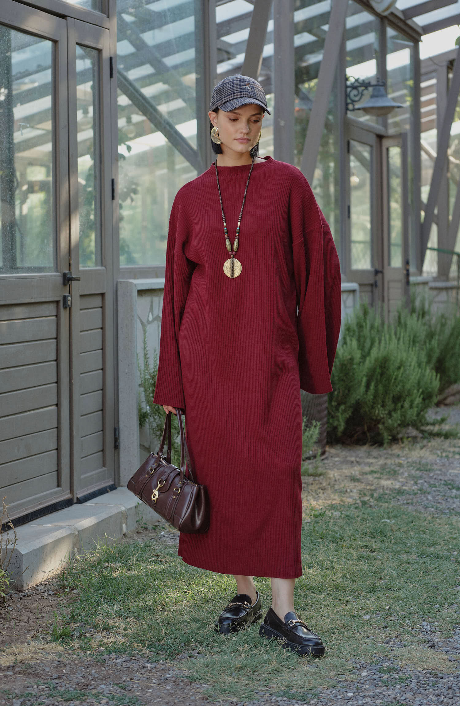 Geniş Kollu Fitilli Bordo Triko Elbise