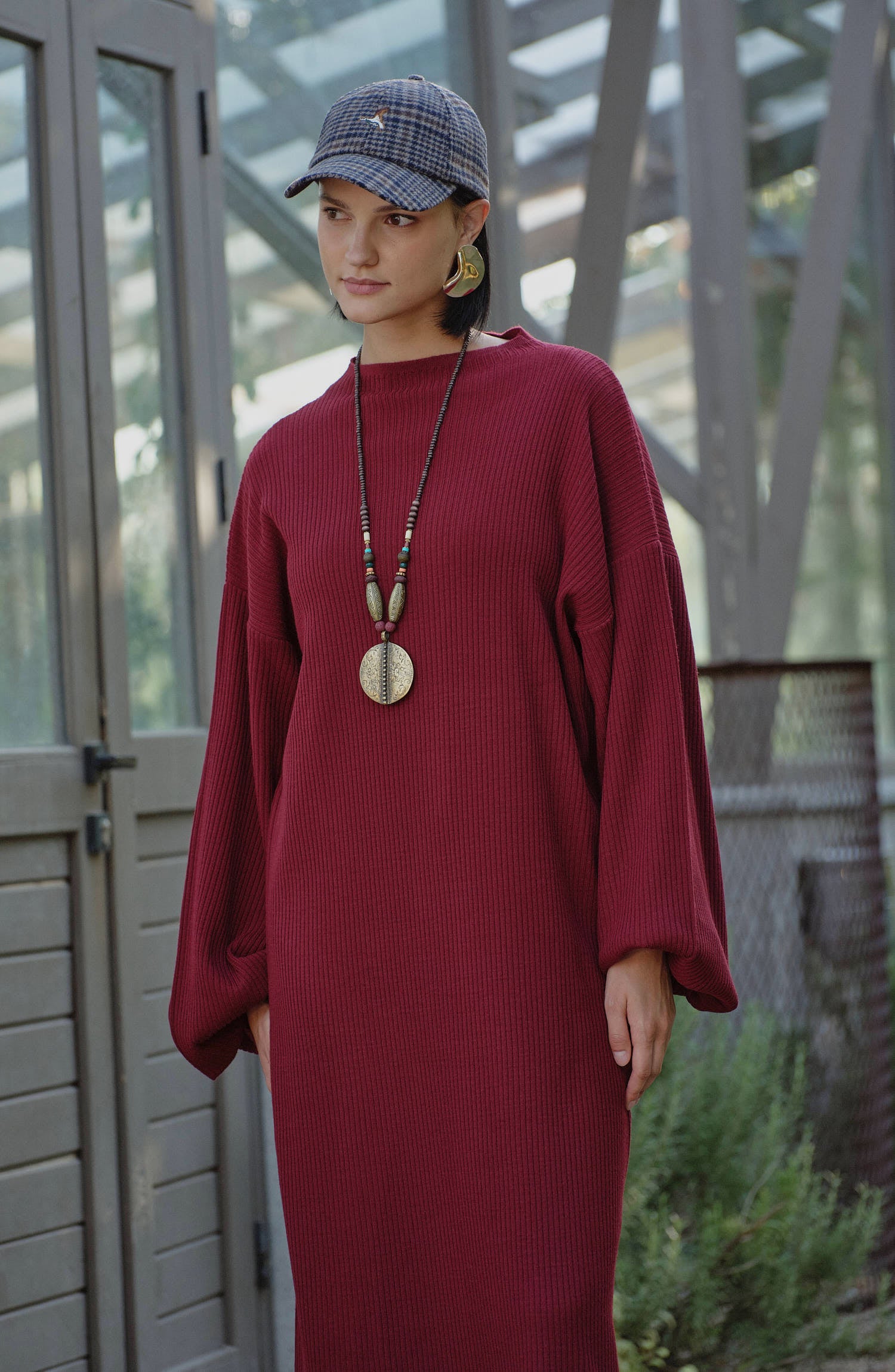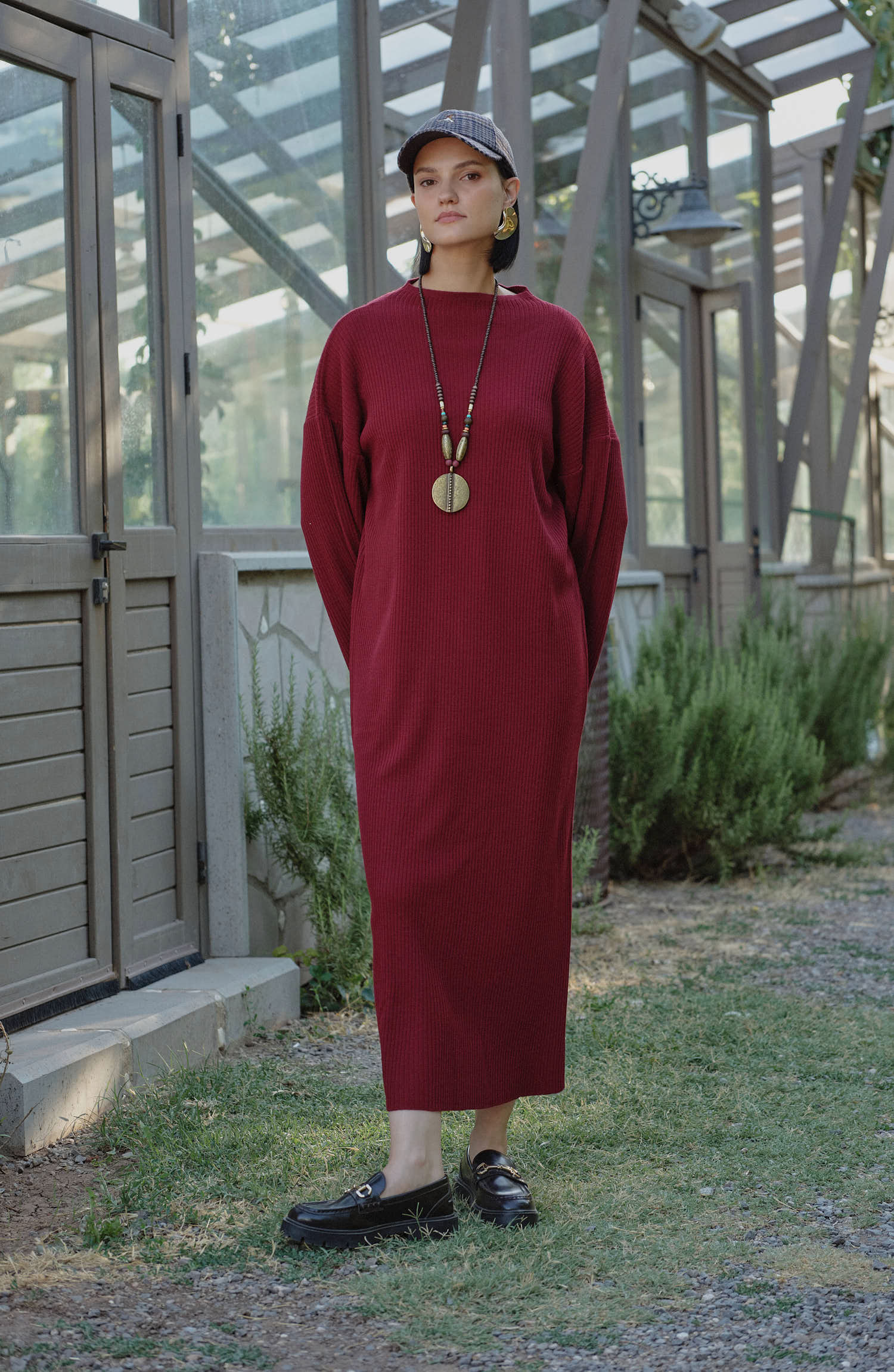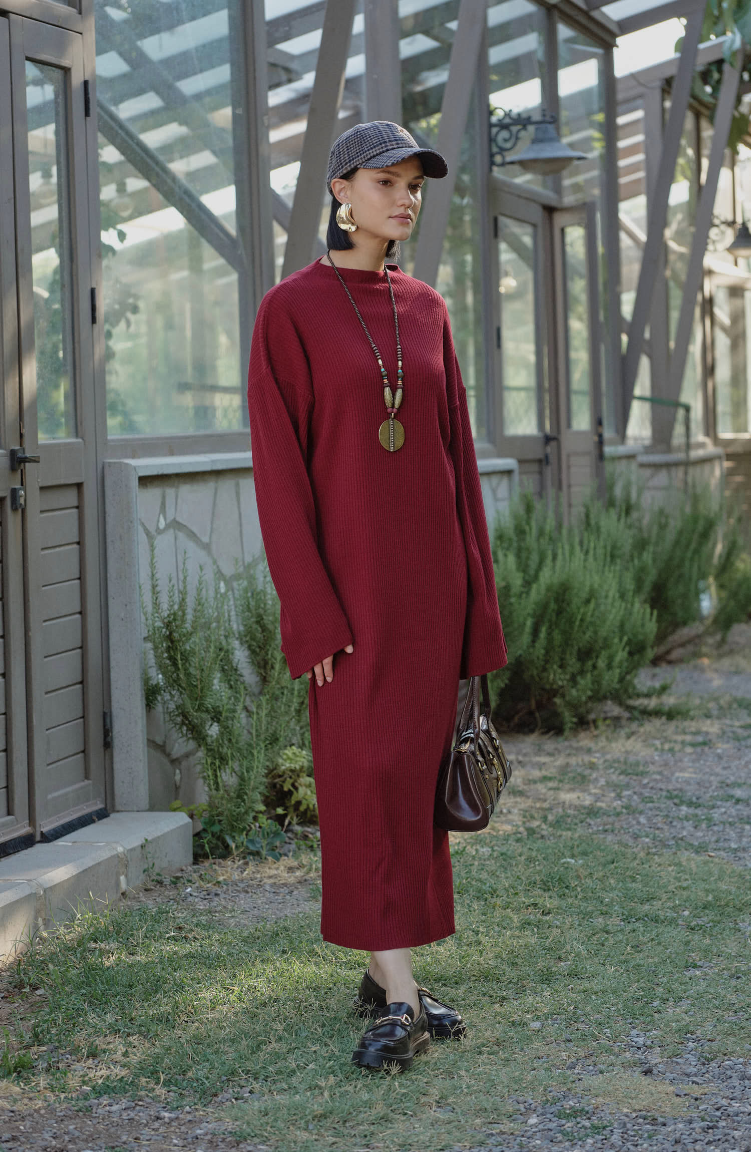Geniş Kollu Fitilli Bordo Triko Elbise