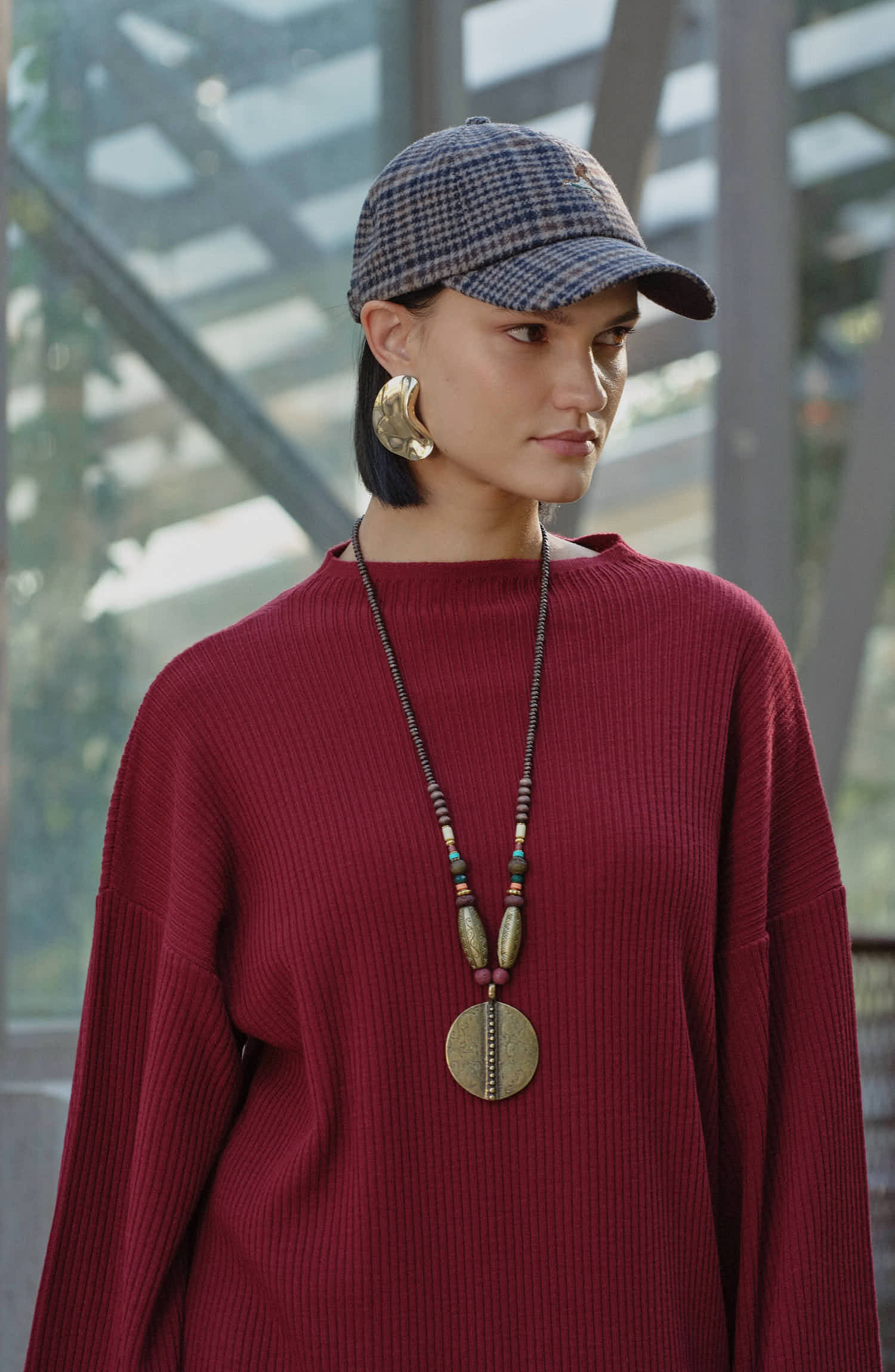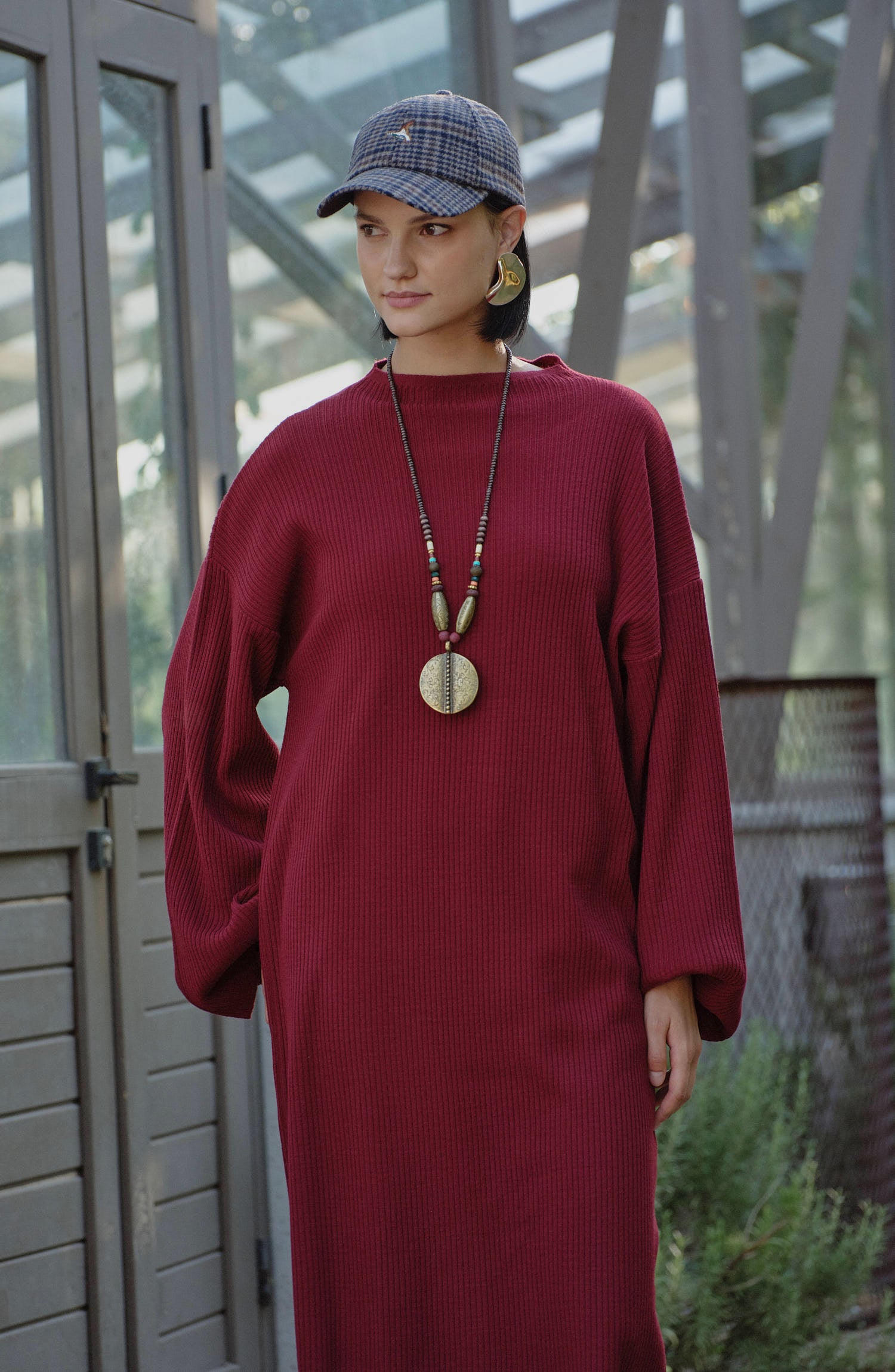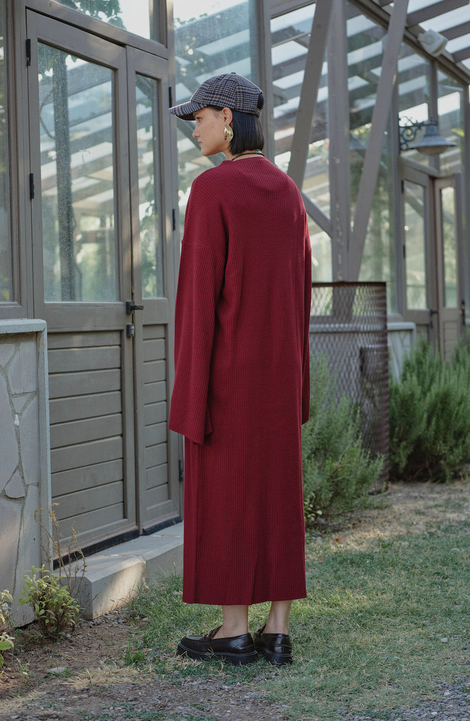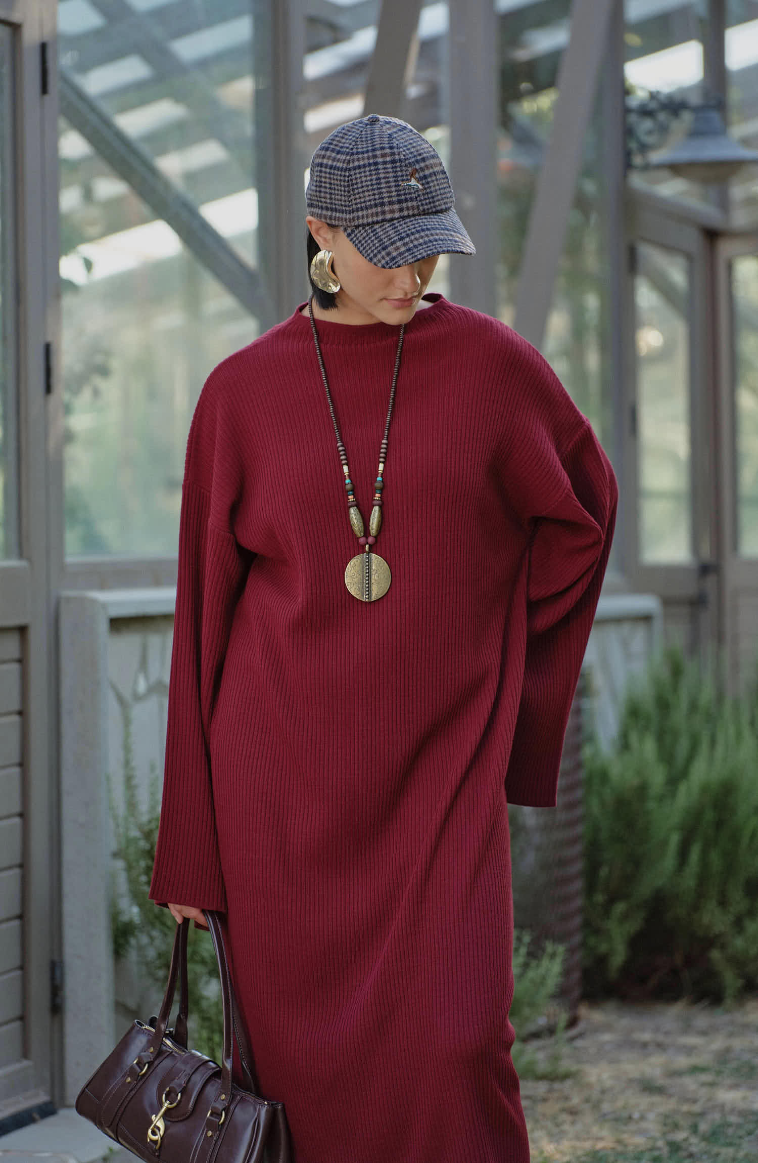 Geniş Kollu Fitilli Bordo Triko Elbise