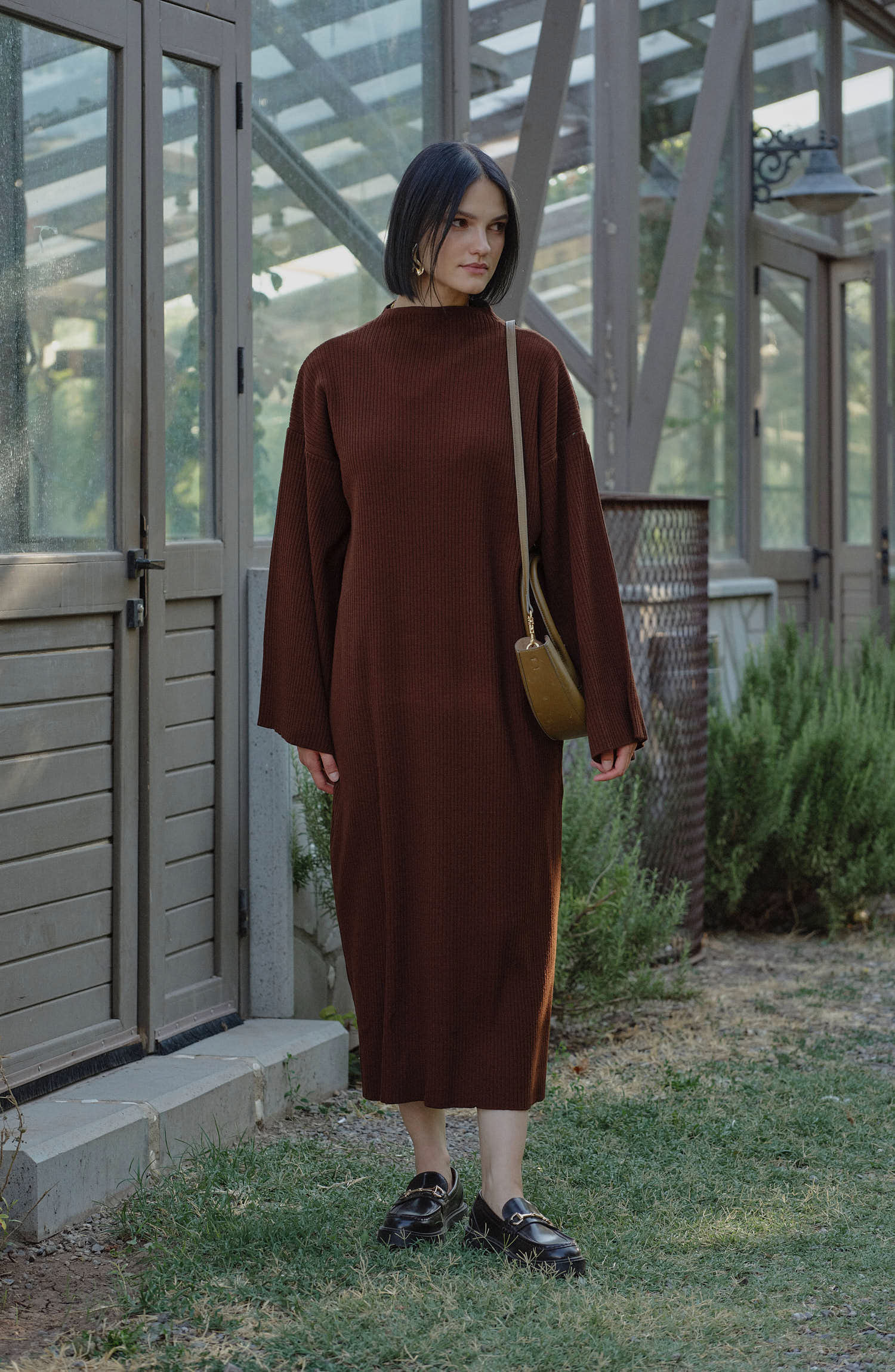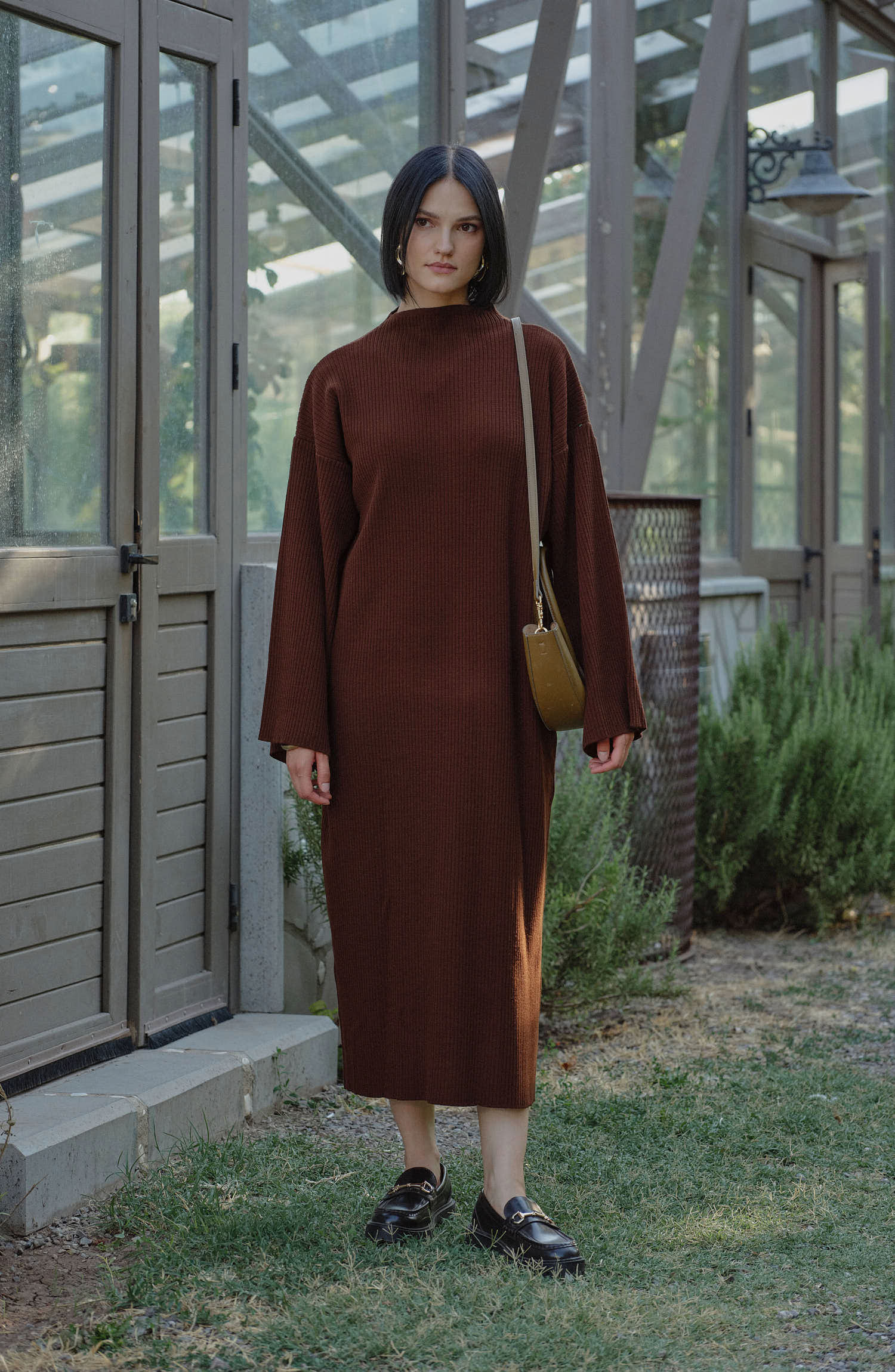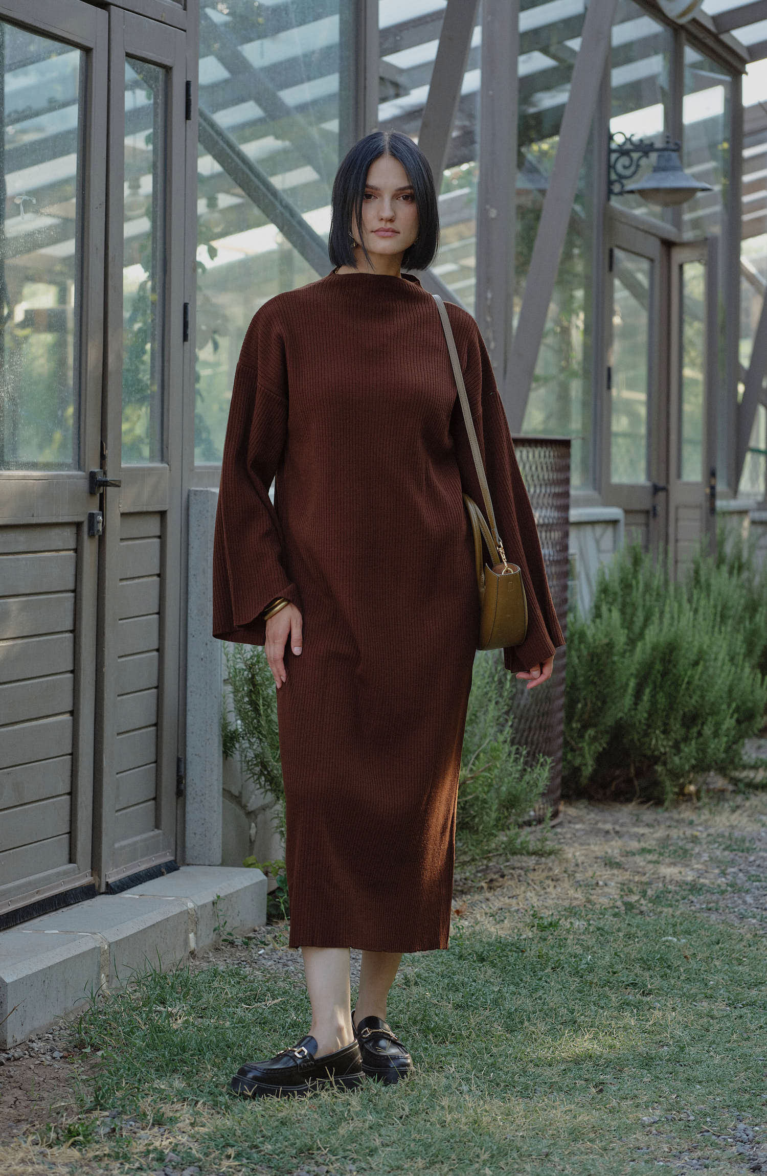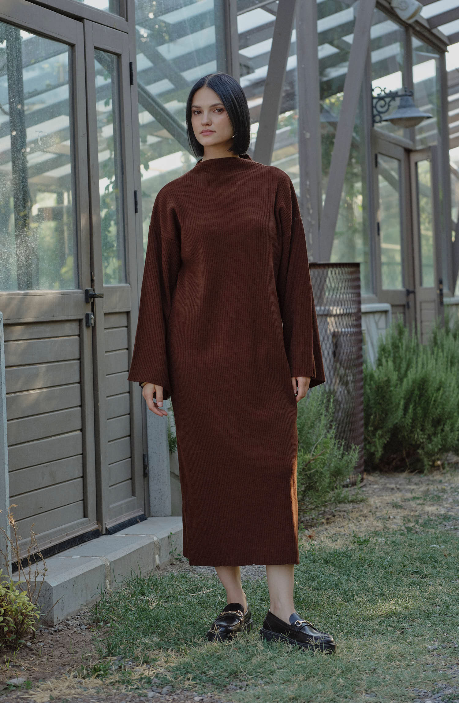 Geniş Kollu Fitilli Kahverengi Triko Elbise