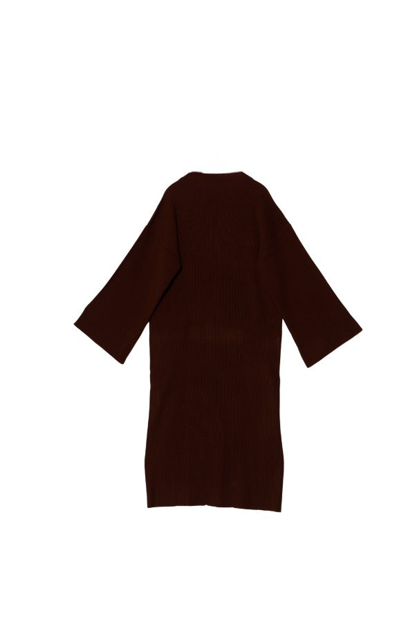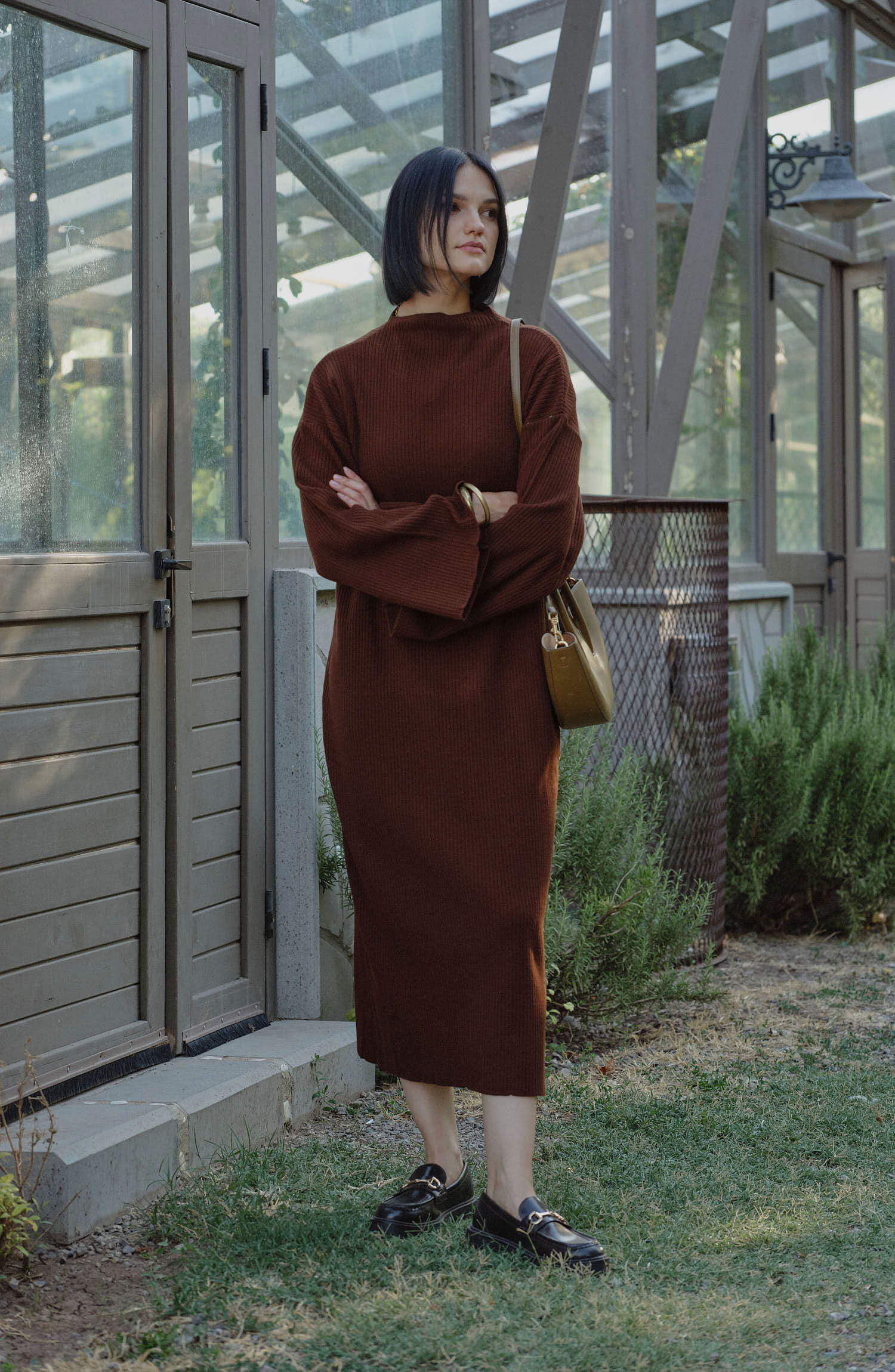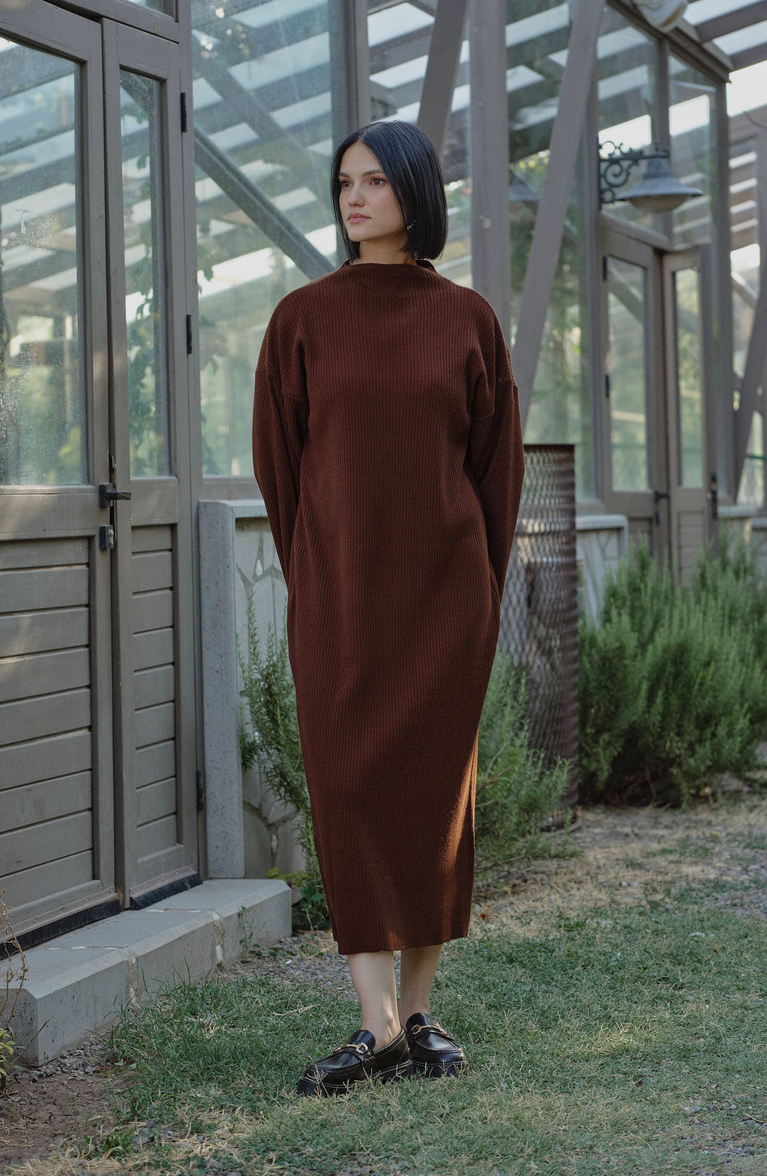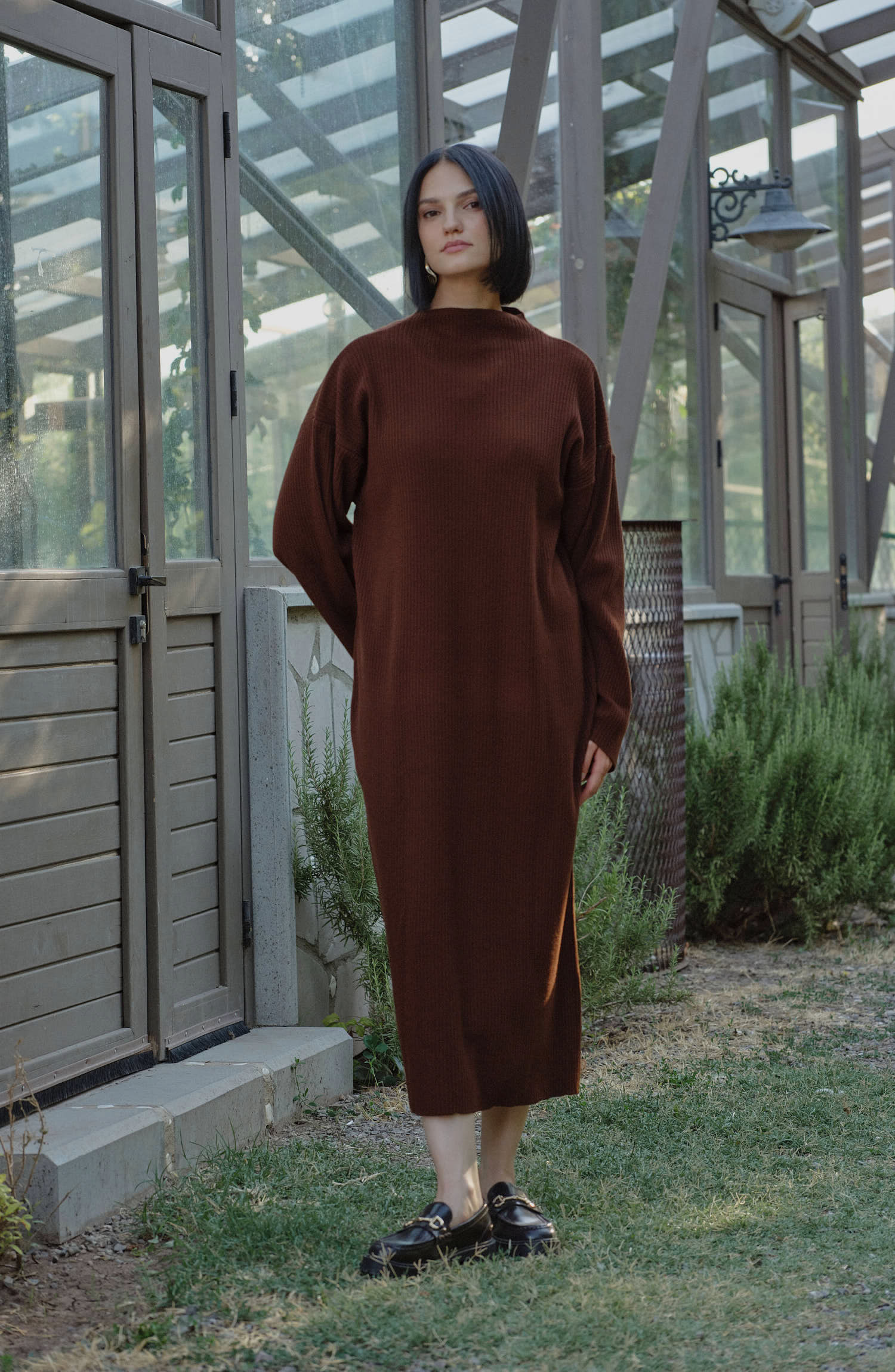Geniş Kollu Fitilli Kahverengi Triko Elbise