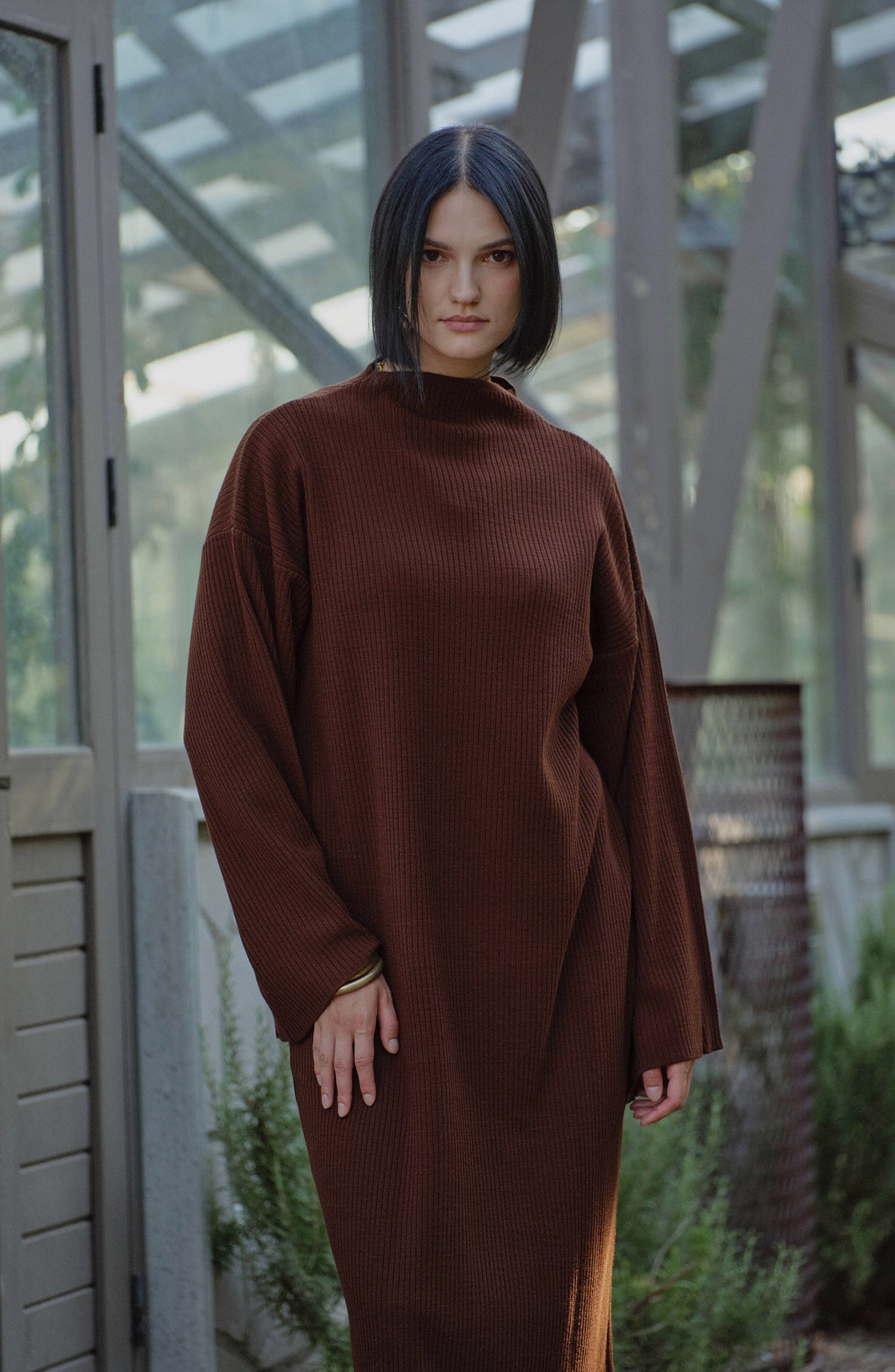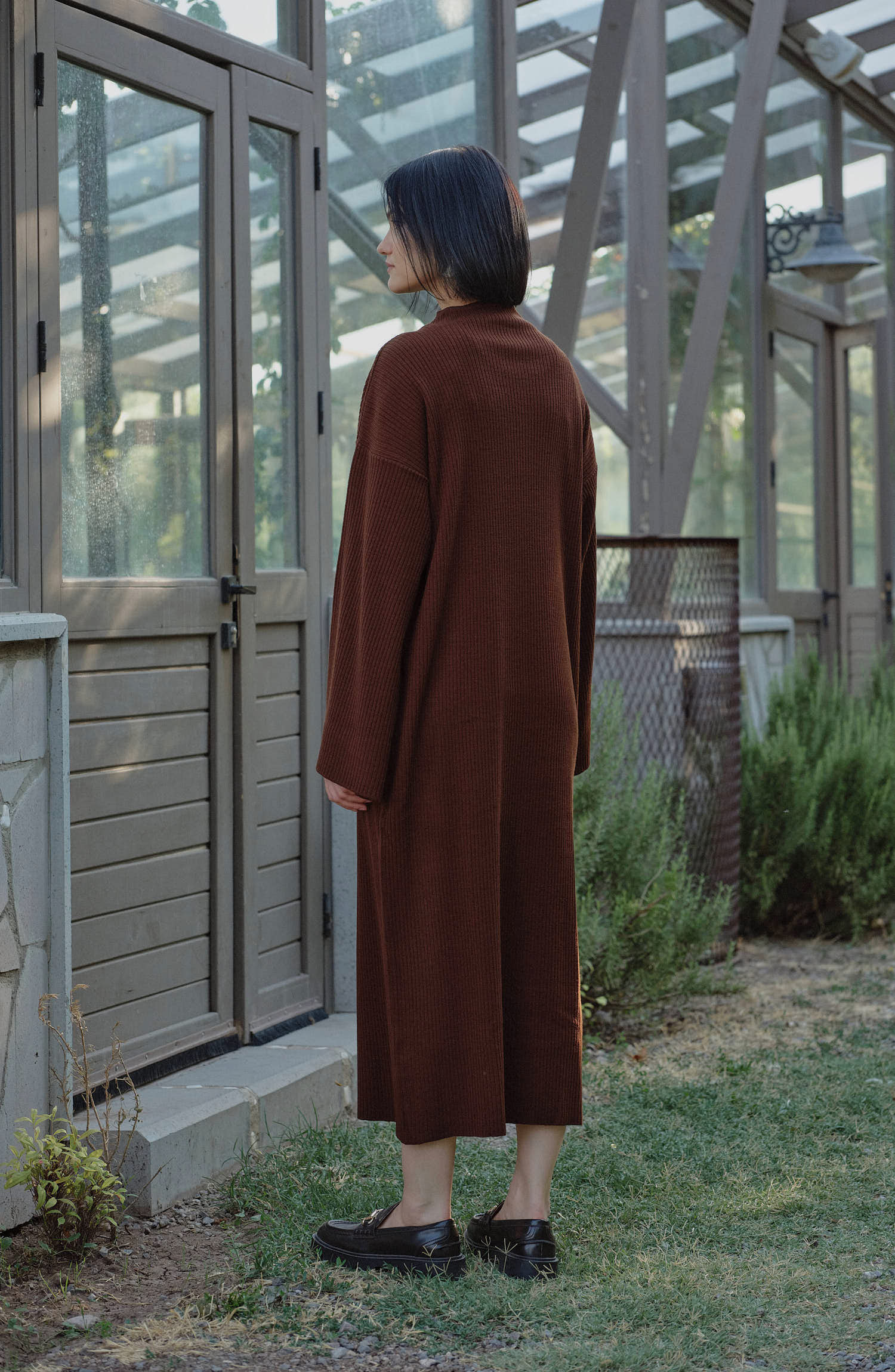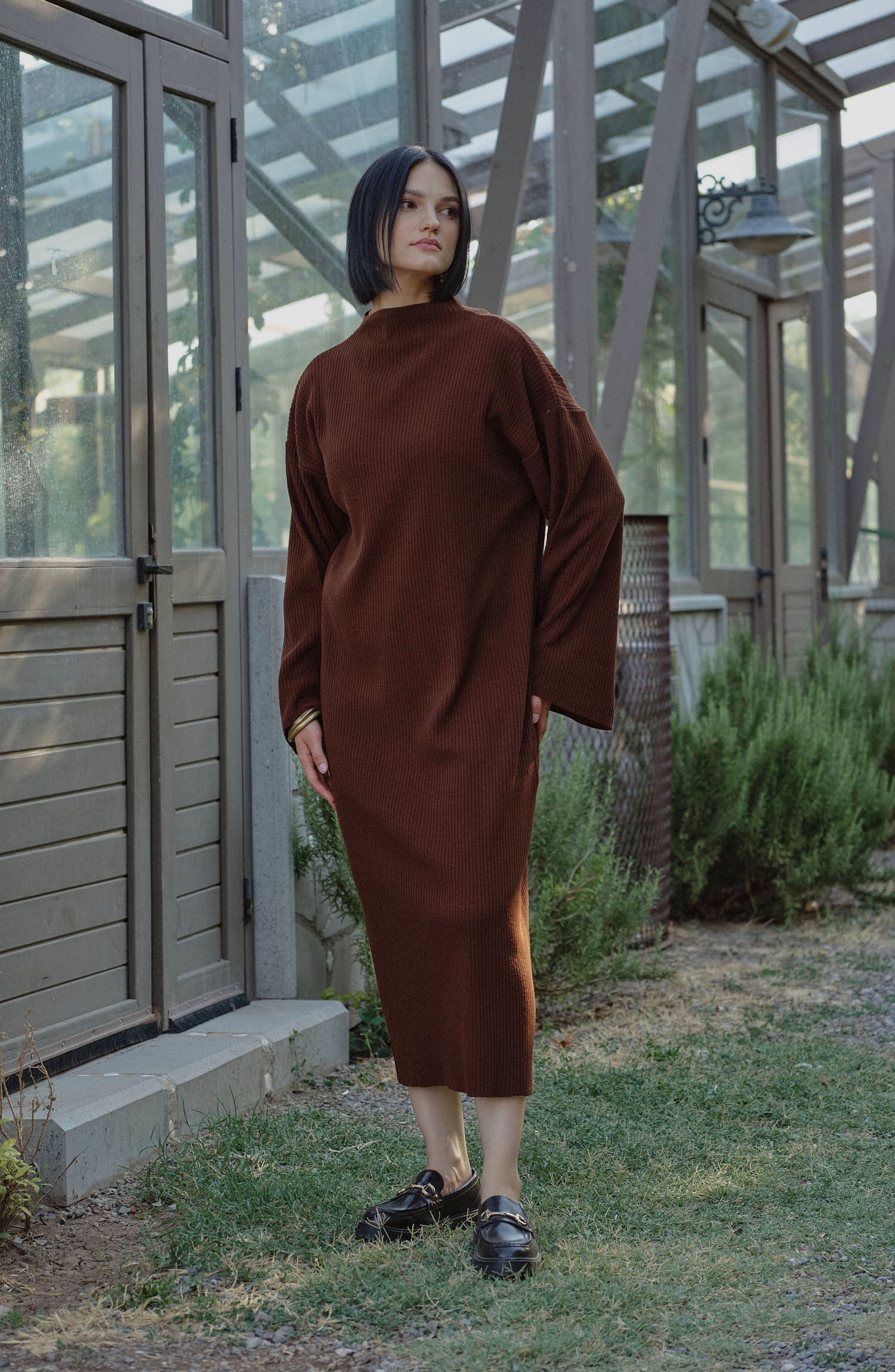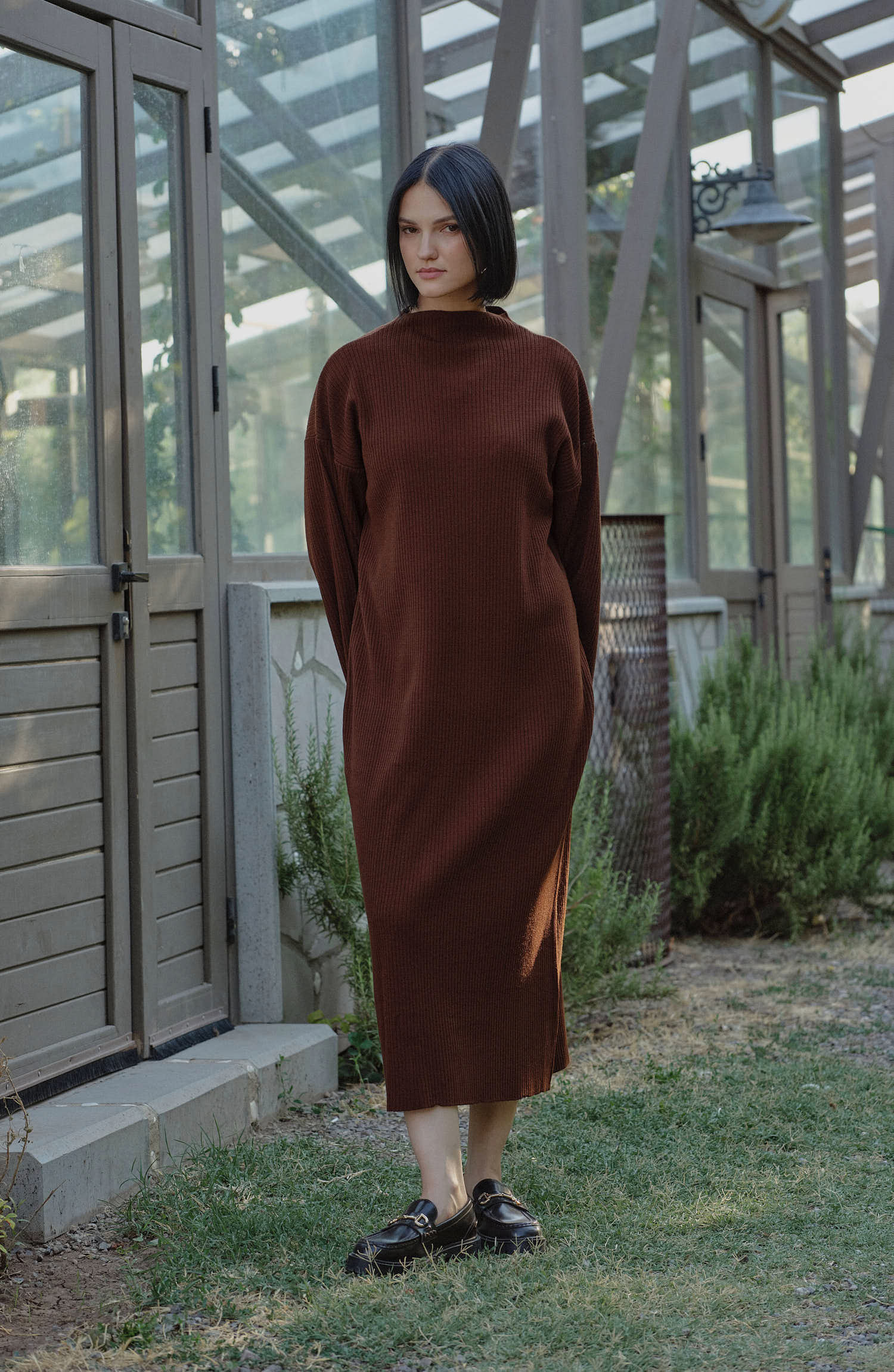 Geniş Kollu Fitilli Kahverengi Triko Elbise