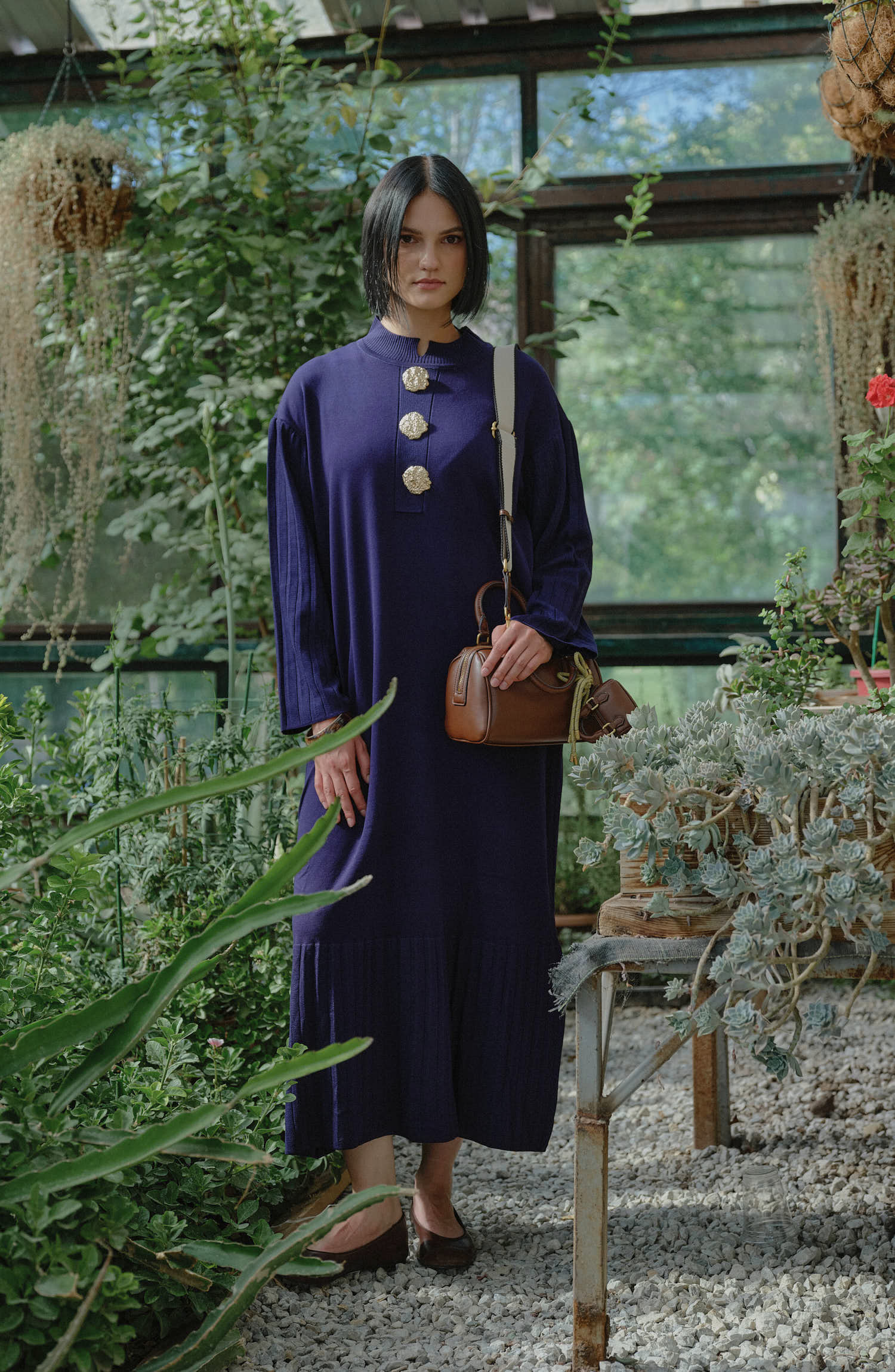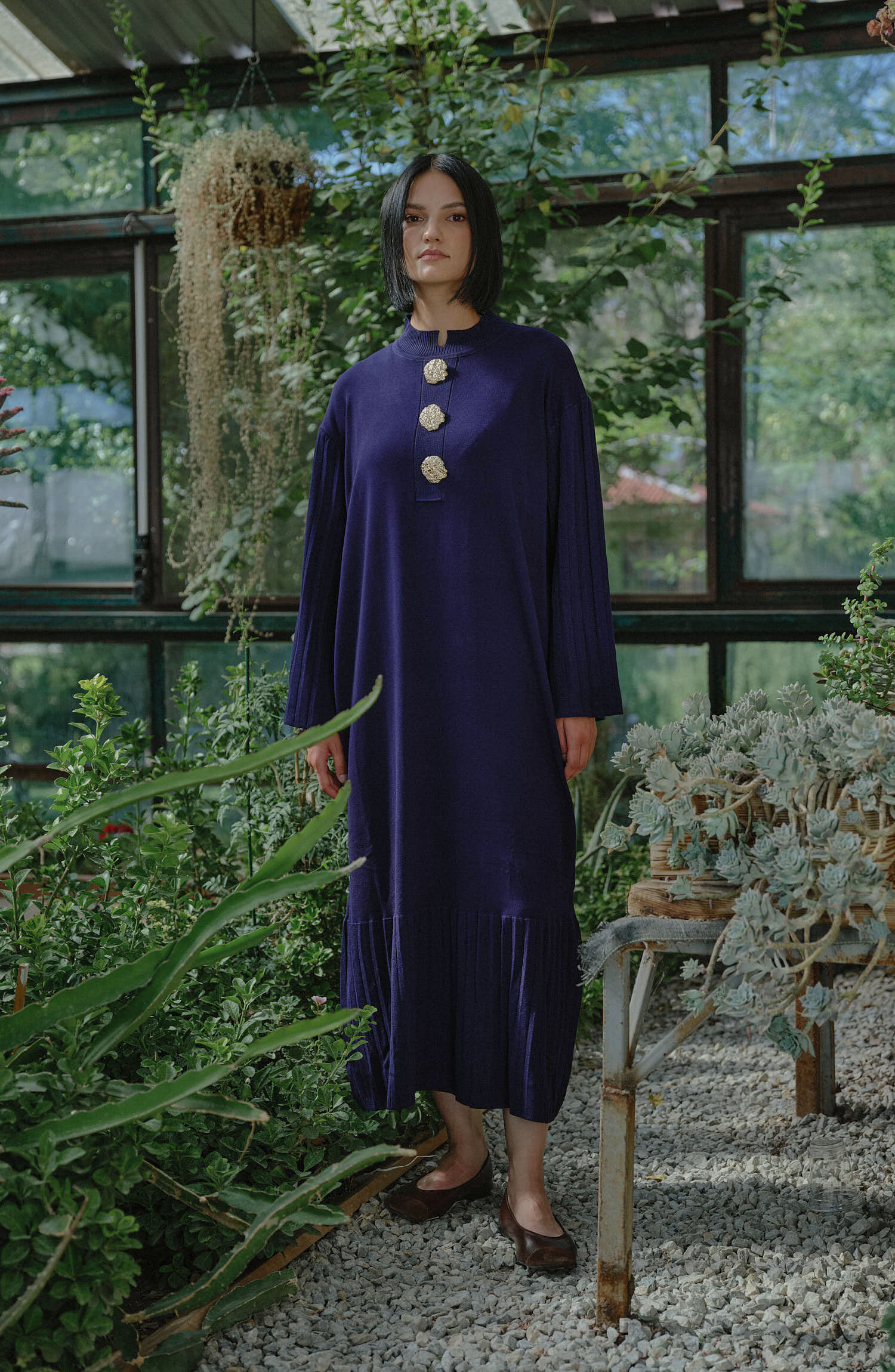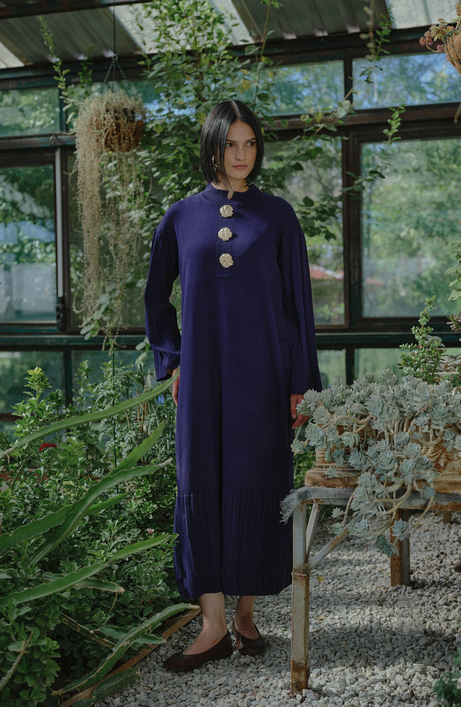 Gold Düğme Detaylı Lacivert Merserize Triko Elbise