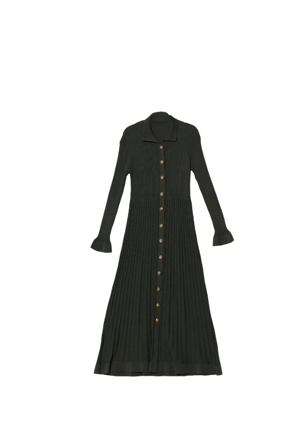 Gold Düğmeli Haki Fitilli Merserize Triko Elbise