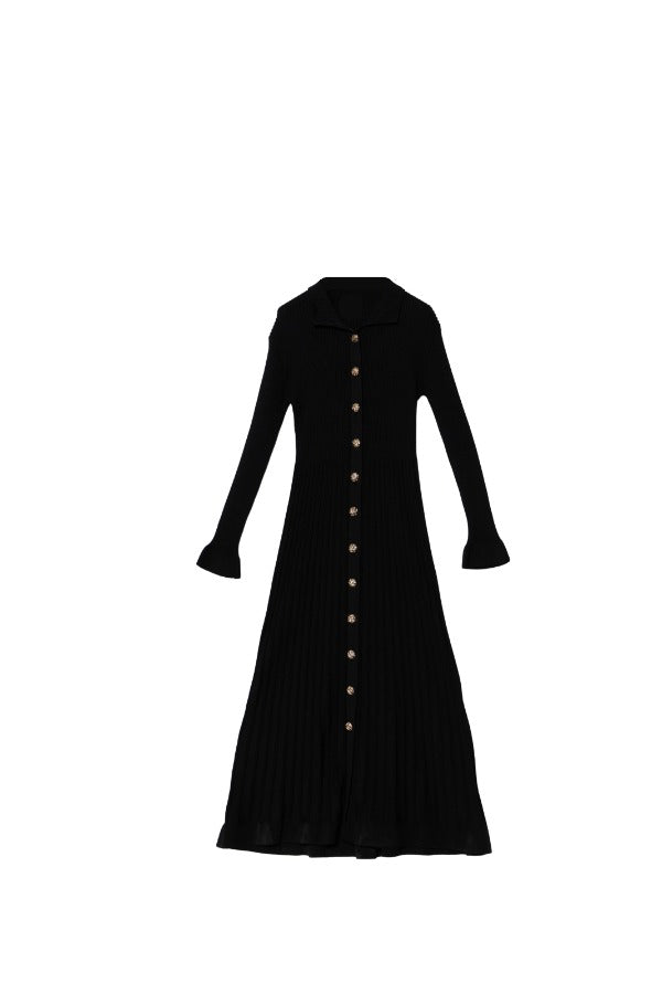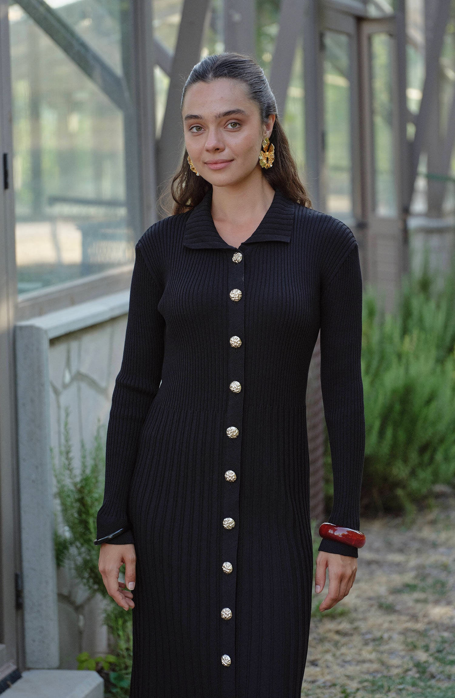 Gold Düğmeli Siyah Fitilli Merserize Triko Elbise