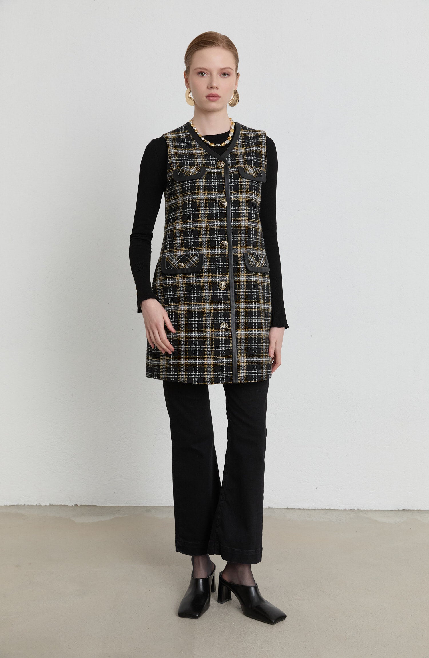 Ekose tüvit dokusu ve deri biye detaylarıyla klasik şıklığı modern bir çizgide sunan bu yelek, V yaka formu ve mineli blazer düğmeleriyle güçlü bir stil oluşturur. Astarlı yapısı sayesinde formunu korurken konforlu bir kullanım sağlar. Süs kapak cepleri tasarıma hareket katar.