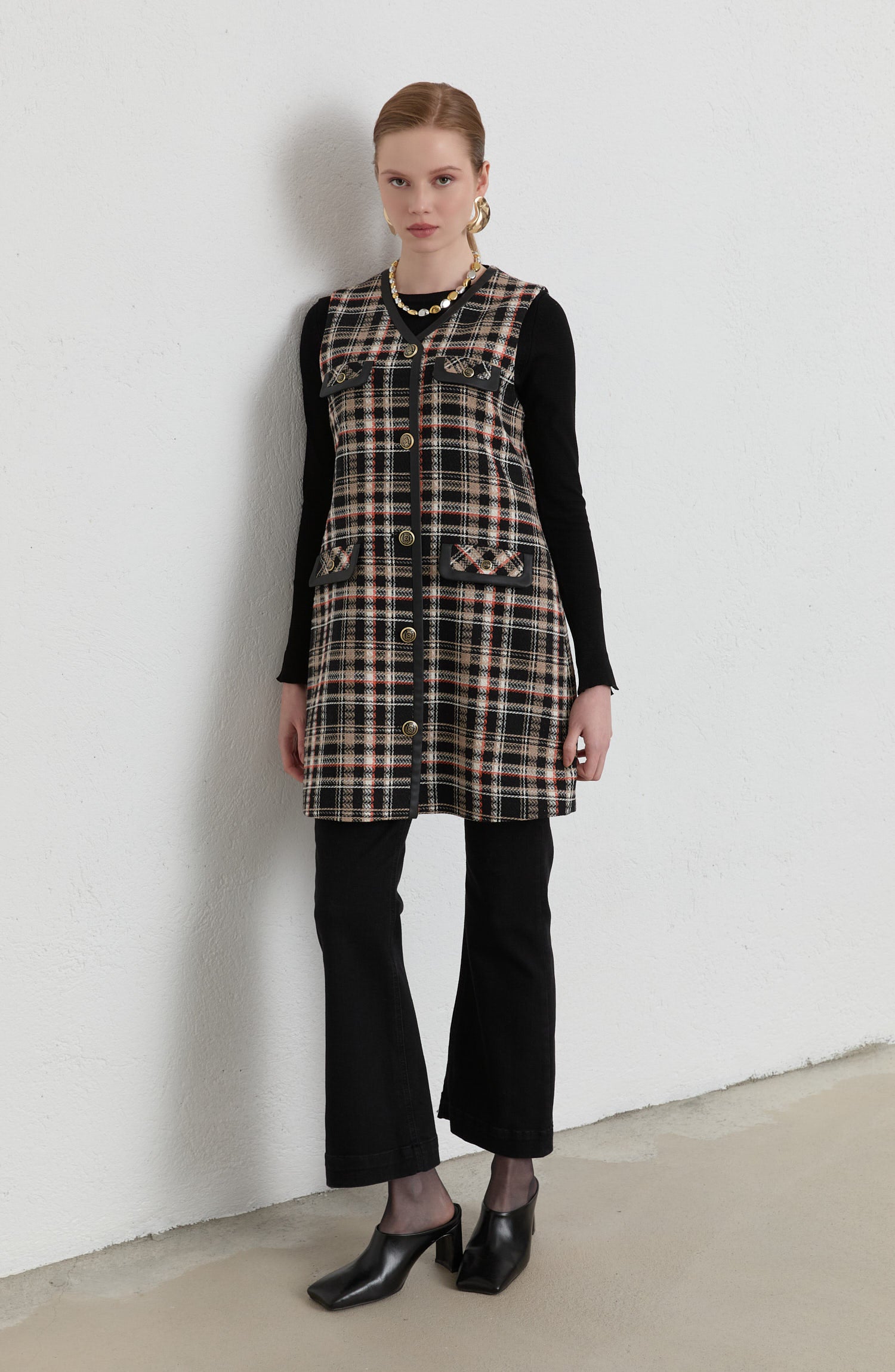 Deri Biyeli Sütlü Kahve Ekose Tüvit Yelek - Fatma Atasoy
