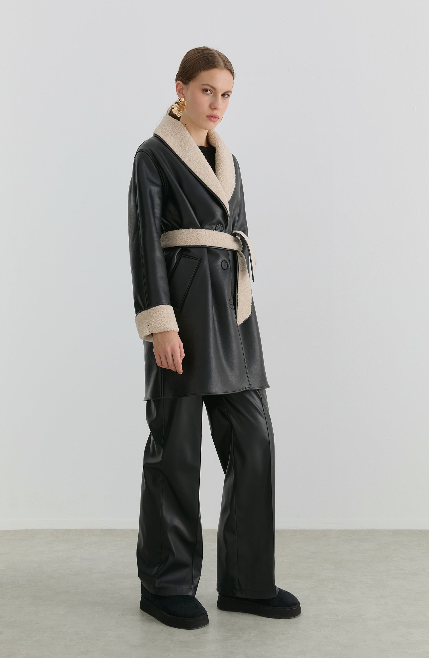 Peluş Detaylı Siyah Suni Deri Kaban - Fatma Atasoy