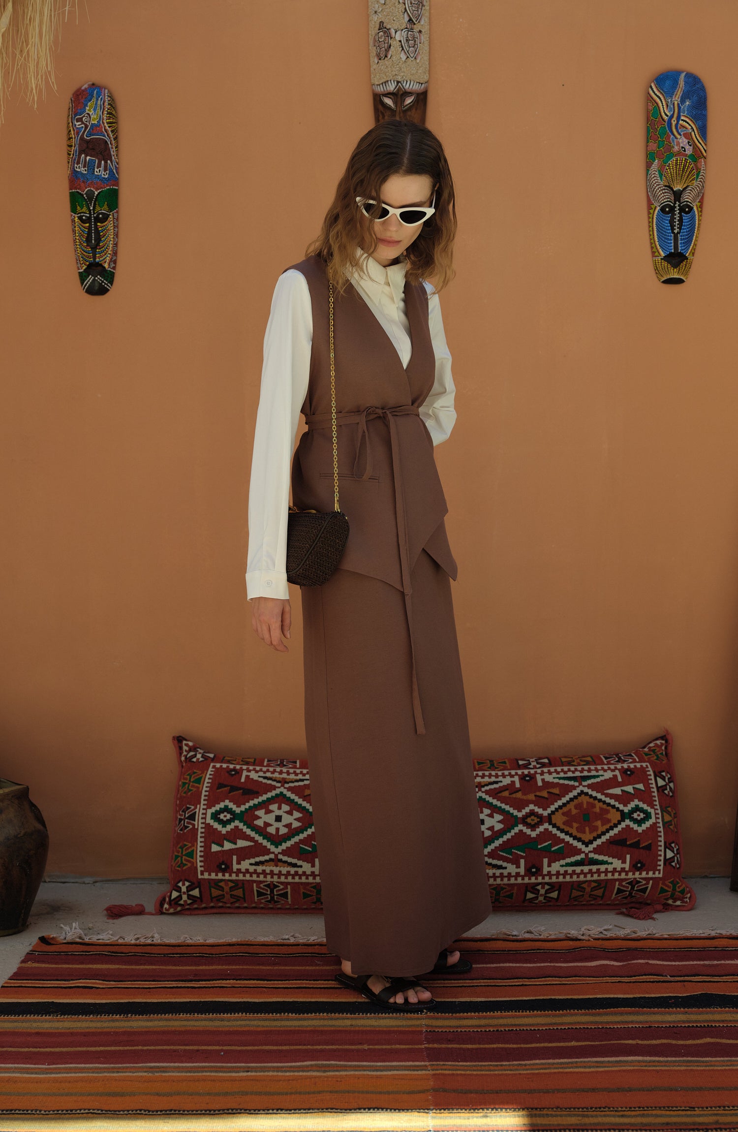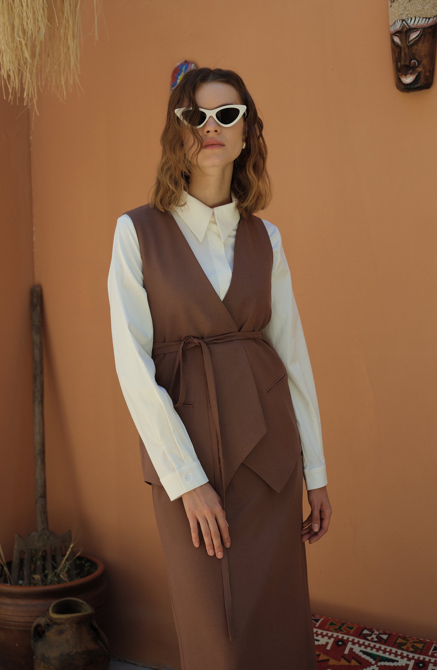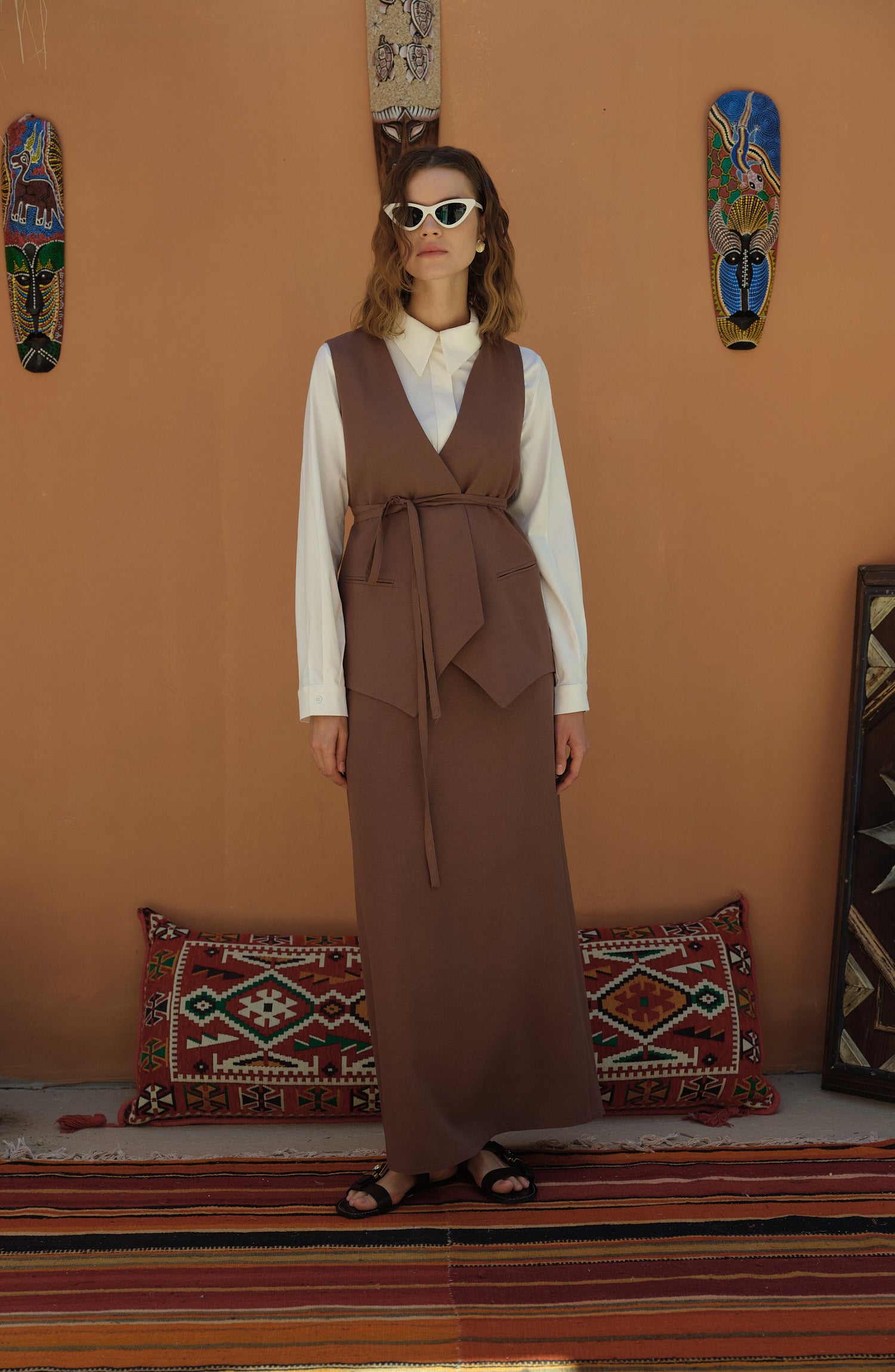 Bağlamalı Keten Kahve Yelek Etek Takım