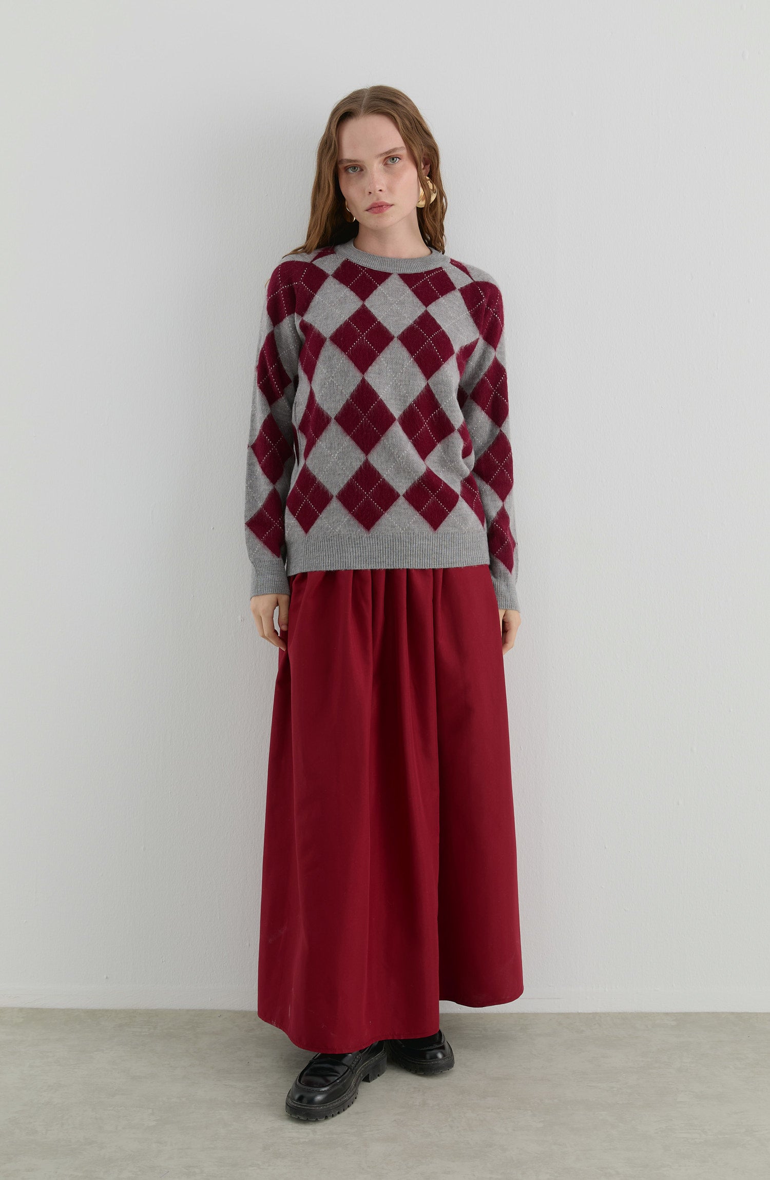 Baklava Desen Gri - Bordo Yumoş Triko Kazak - Fatma Atasoy