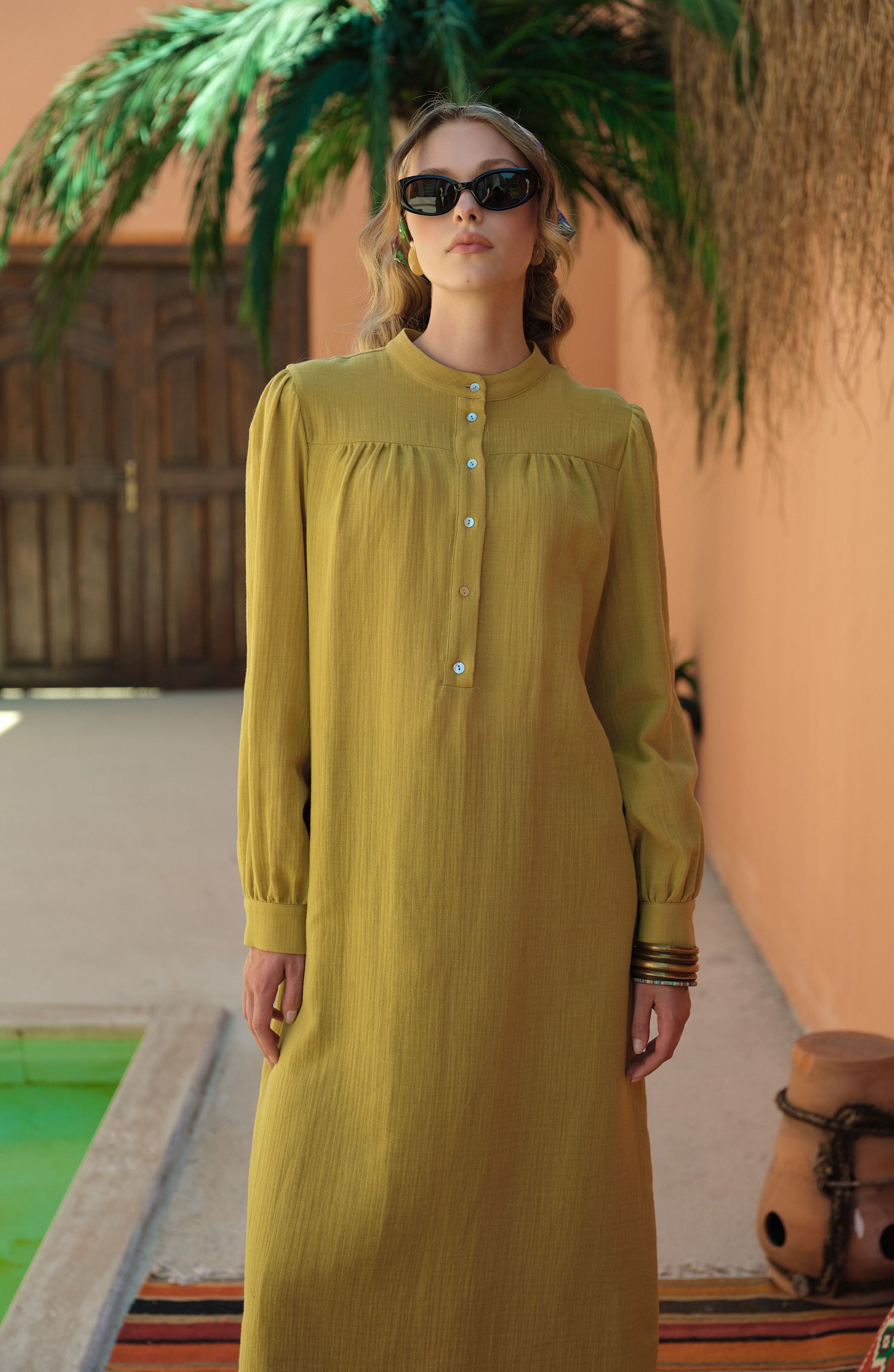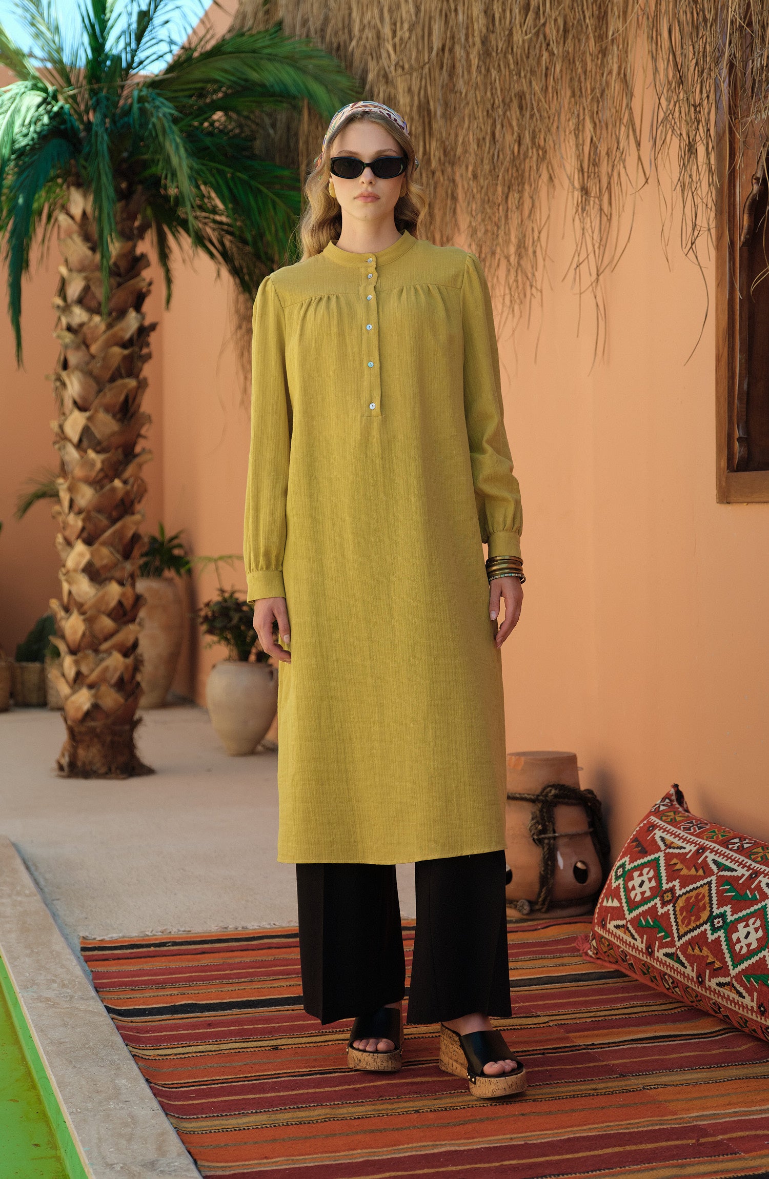 Büzgü Robalı Maksi Müslin Yağ Yeşili Tunik