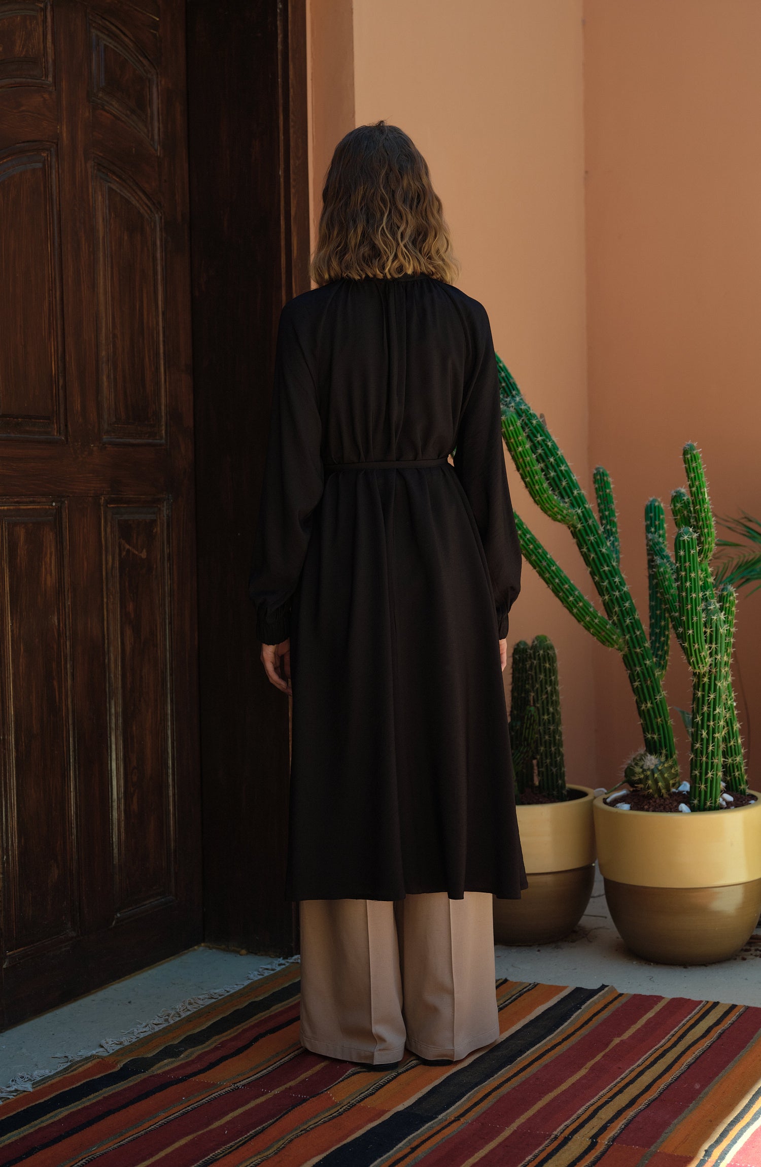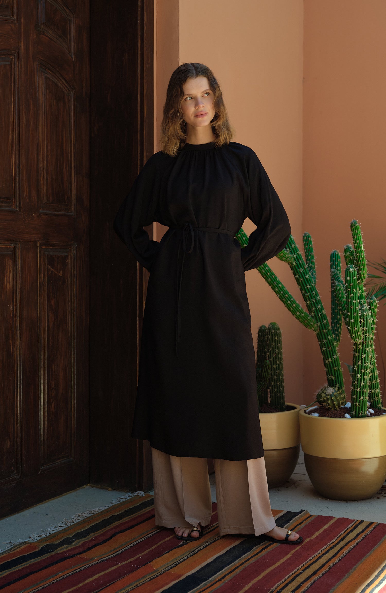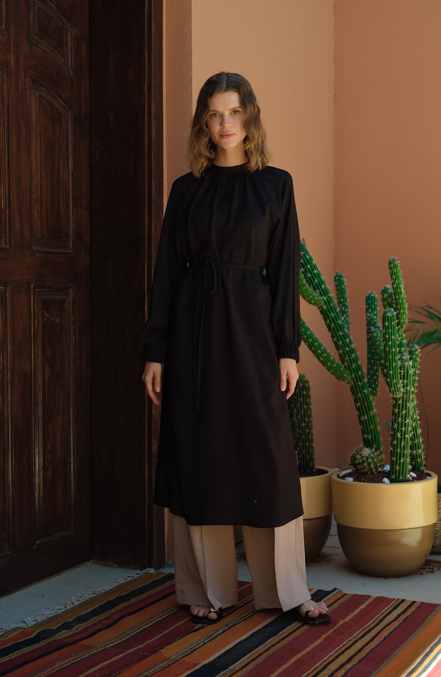 Büzgülü Bağlamalı Maksi Siyah Tunik