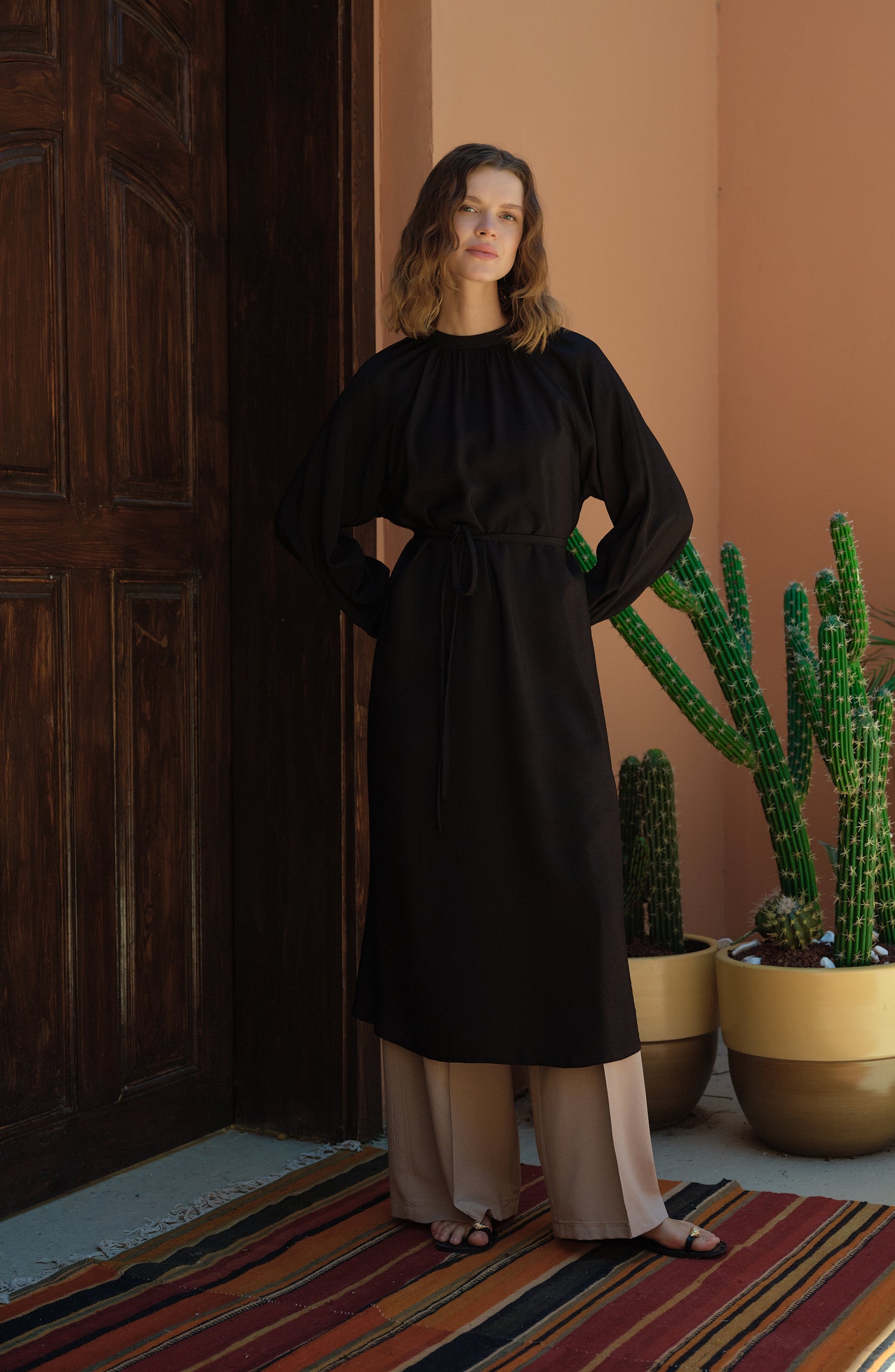 Büzgülü Bağlamalı Maksi Siyah Tunik - Fatma Atasoy