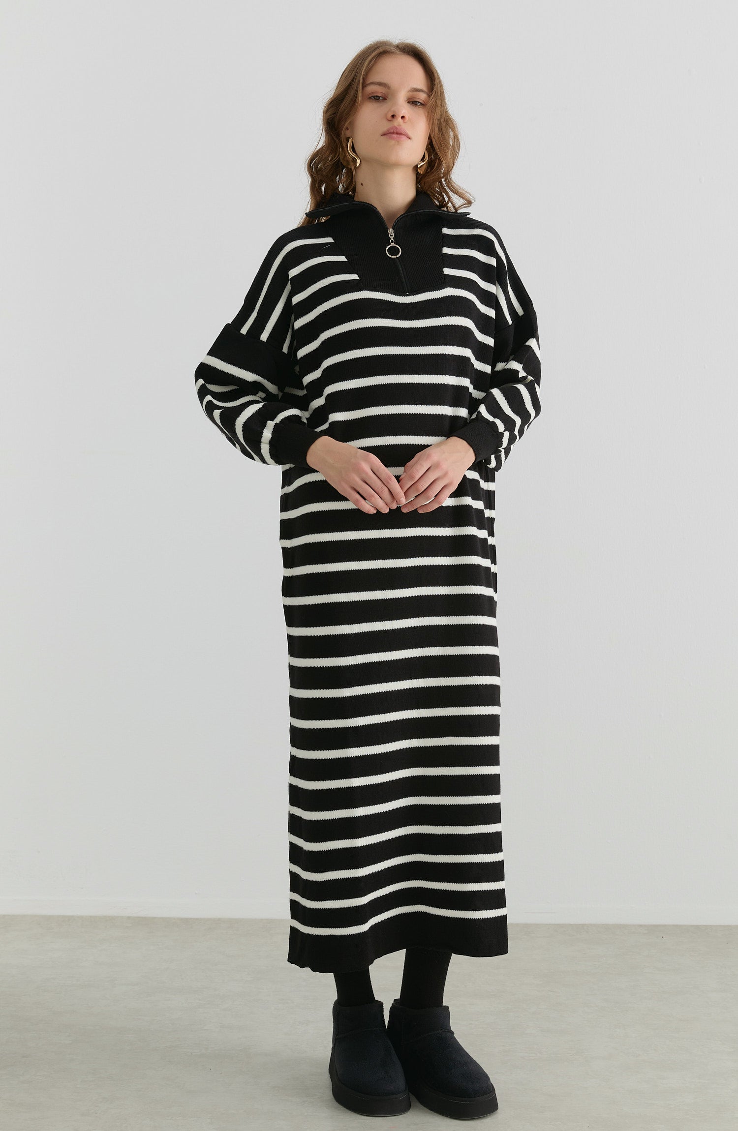 Konforu ve modern çizgiyi bir araya getiren Çizgili Triko Elbise, sezonun en trend detaylarını zarif bir şekilde buluşturuyor. Düşük omuz kesimi ve balon kollarıyla hacimli bir siluet oluştururken, dik yaka tasarımı ile sportif bir duruş kazandırıyor. Yarım patlı fermuar detayı, kullanımda kolaylık ve şıklık sunar. Yakası, kol ucu ve etek ucundaki fitilli triko detaylar ise ürüne dinamik bir görünüm kazandırır. Orta kalınlıktaki dokusu sayesinde hem mevsim geçişlerinde hem de serin günlerde rahatlıkla tercih edilebilir.