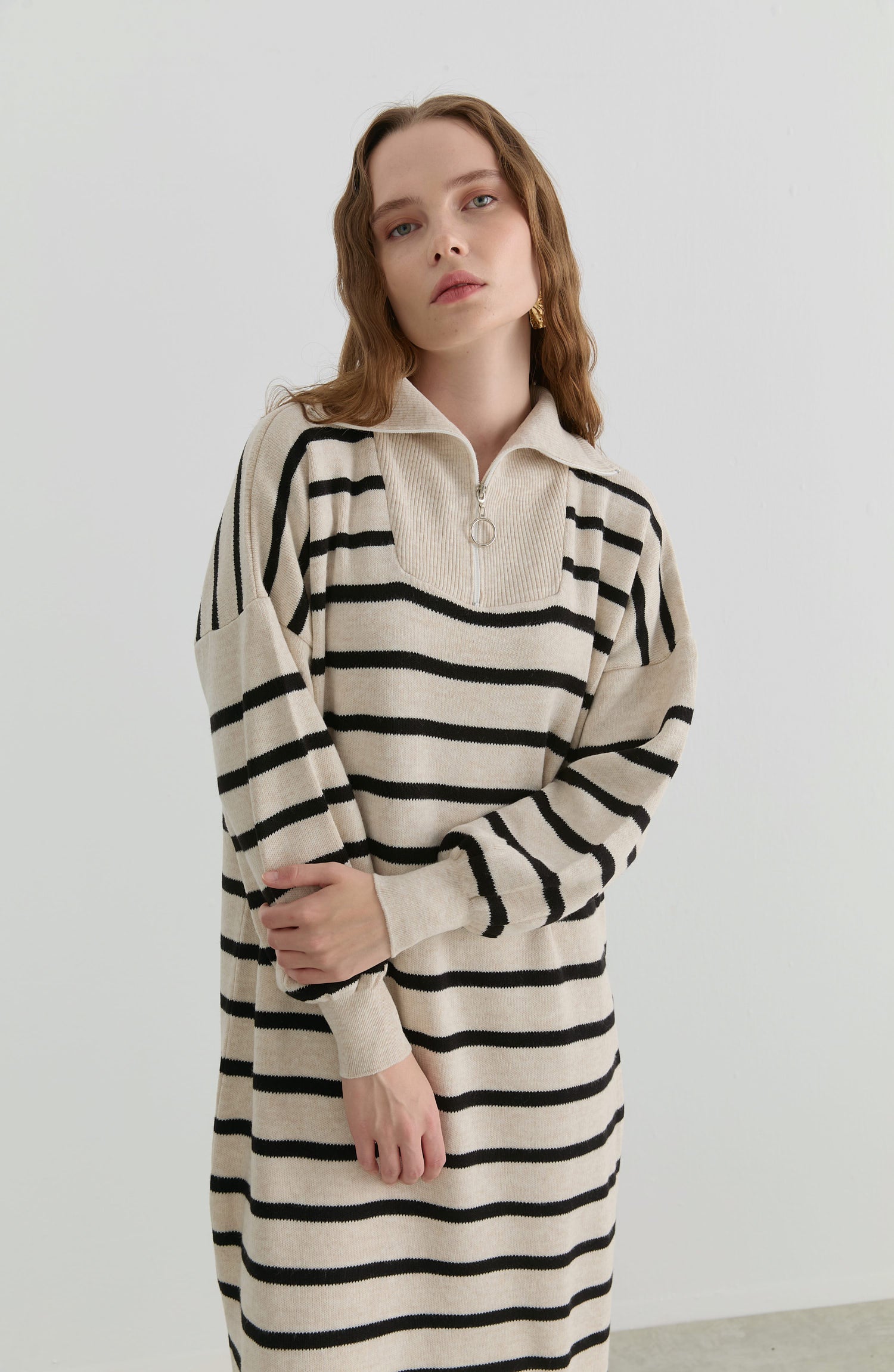 Konforu ve modern çizgiyi bir araya getiren Çizgili Triko Elbise, sezonun en trend detaylarını zarif bir şekilde buluşturuyor. Düşük omuz kesimi ve balon kollarıyla hacimli bir siluet oluştururken, dik yaka tasarımı ile sportif bir duruş kazandırıyor. Yarım patlı fermuar detayı, kullanımda kolaylık ve şıklık sunar. Yakası, kol ucu ve etek ucundaki fitilli triko detaylar ise ürüne dinamik bir görünüm kazandırır. Orta kalınlıktaki dokusu sayesinde hem mevsim geçişlerinde hem de serin günlerde rahatlıkla tercih edilebilir.