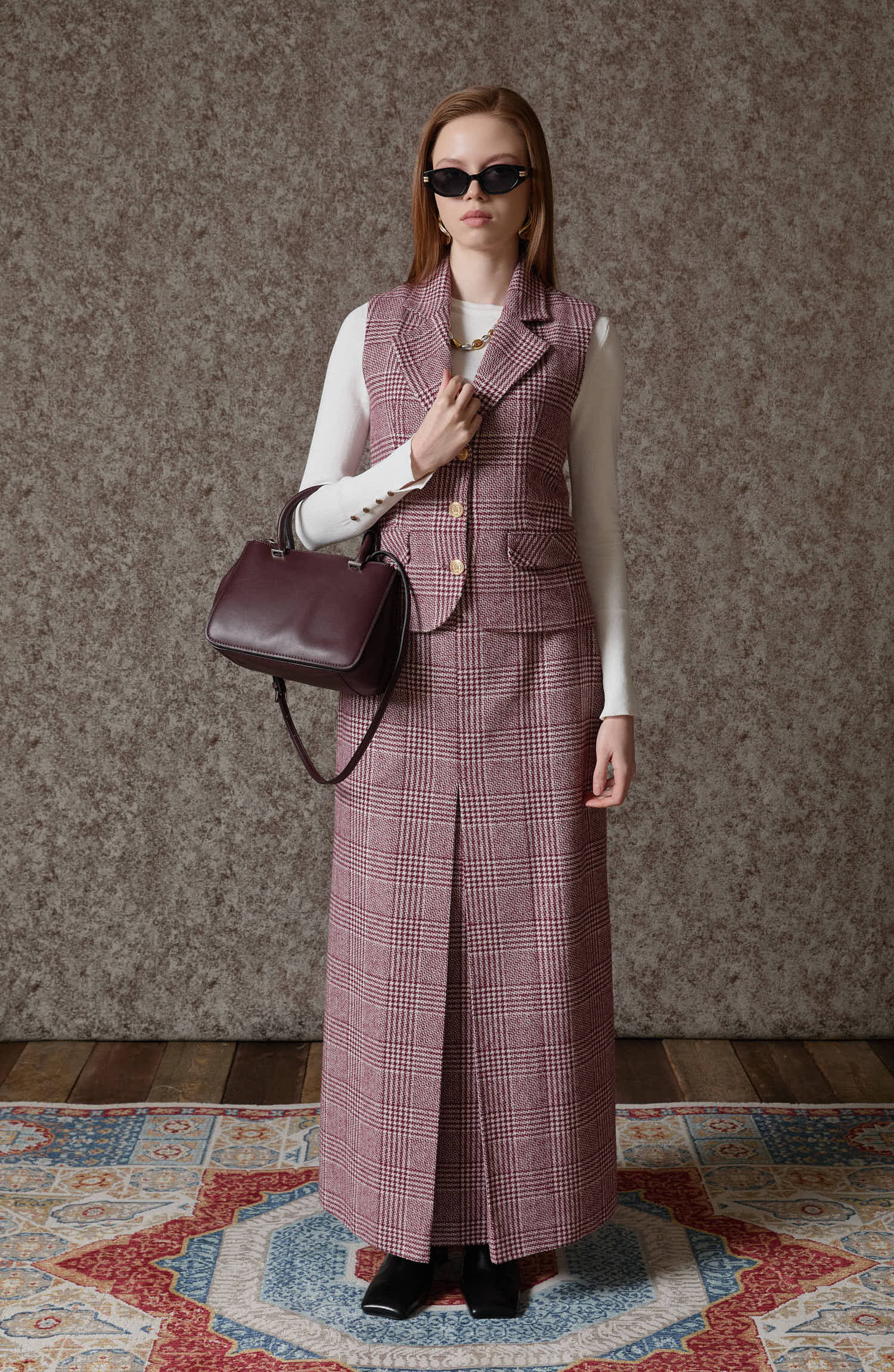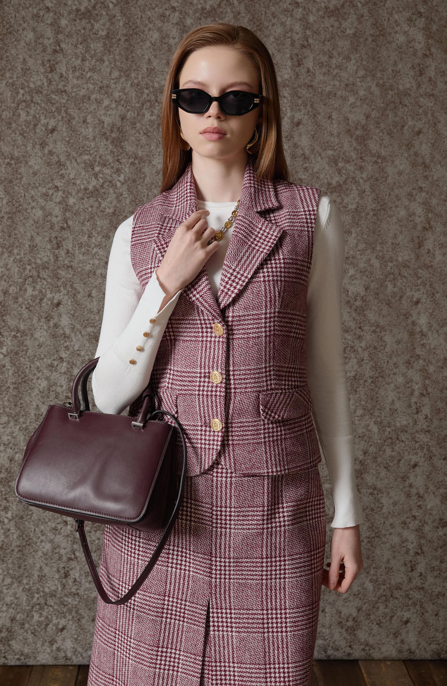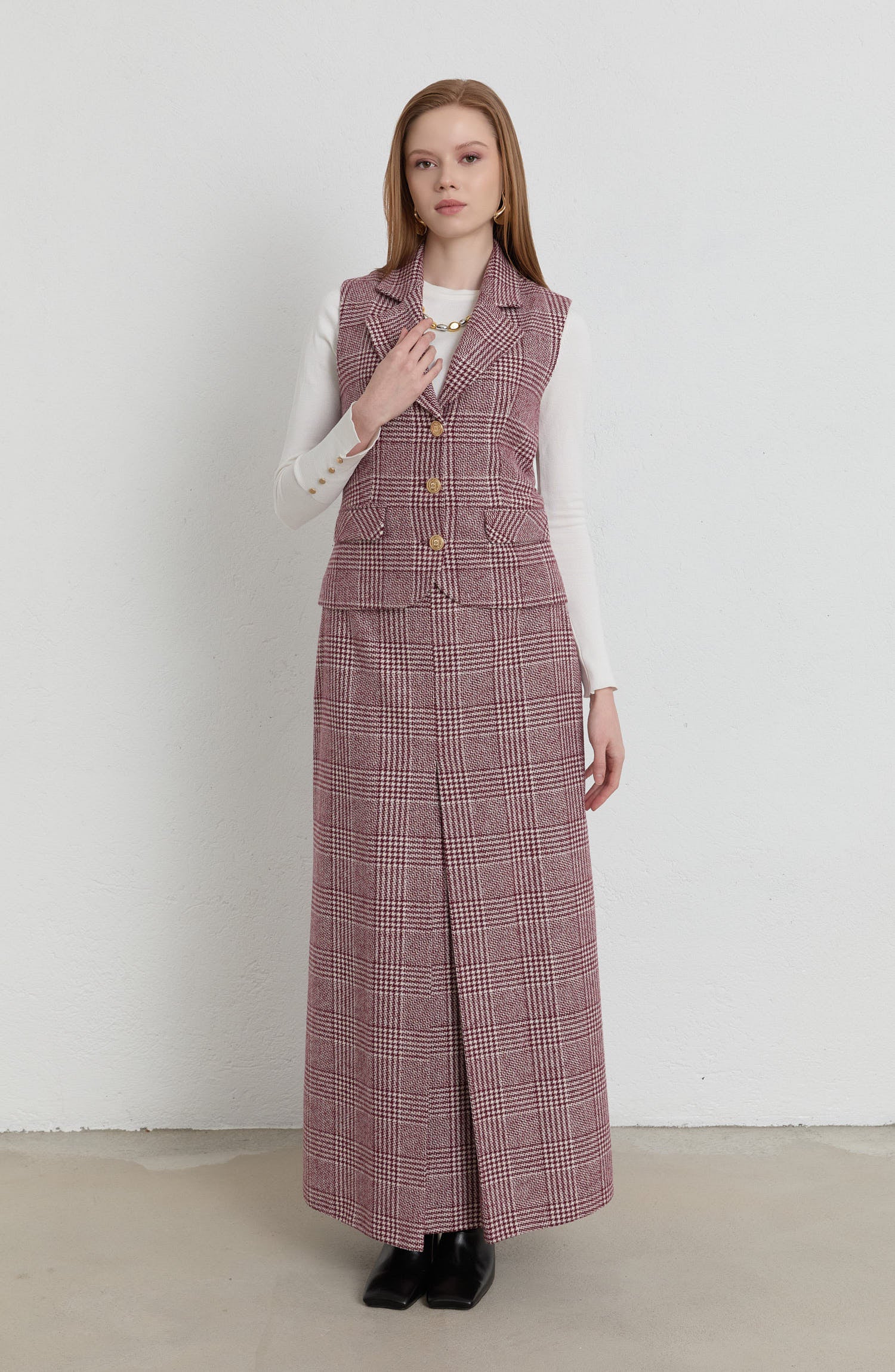 Ekose Kazayağı Blazer Bordo Yelek Etek Takım
