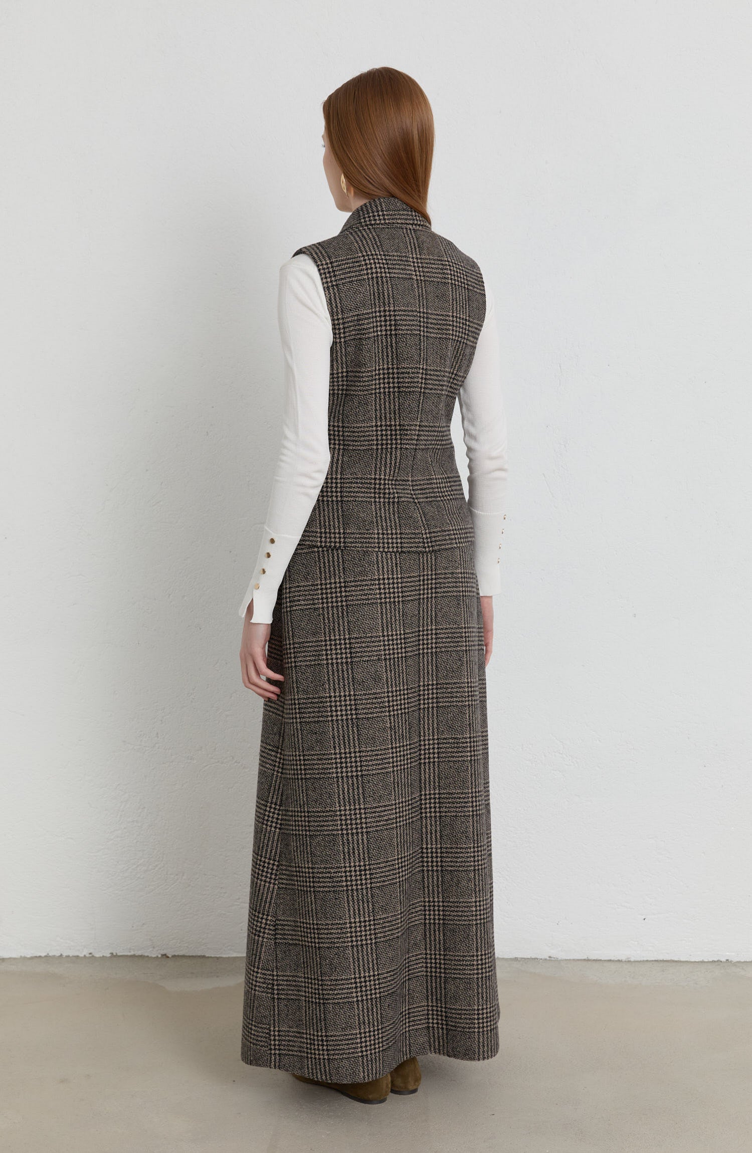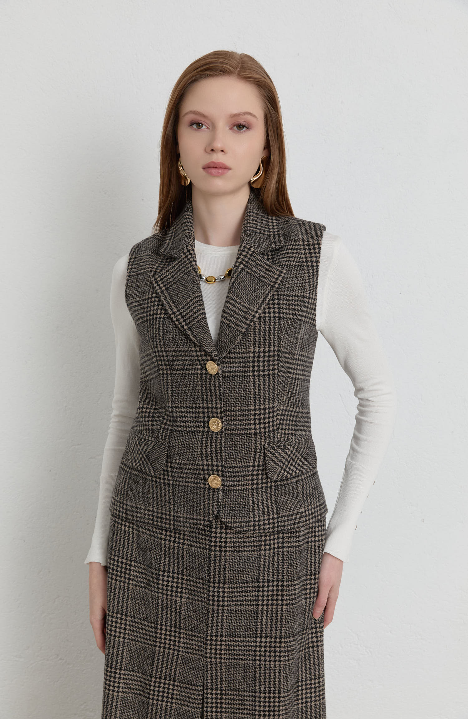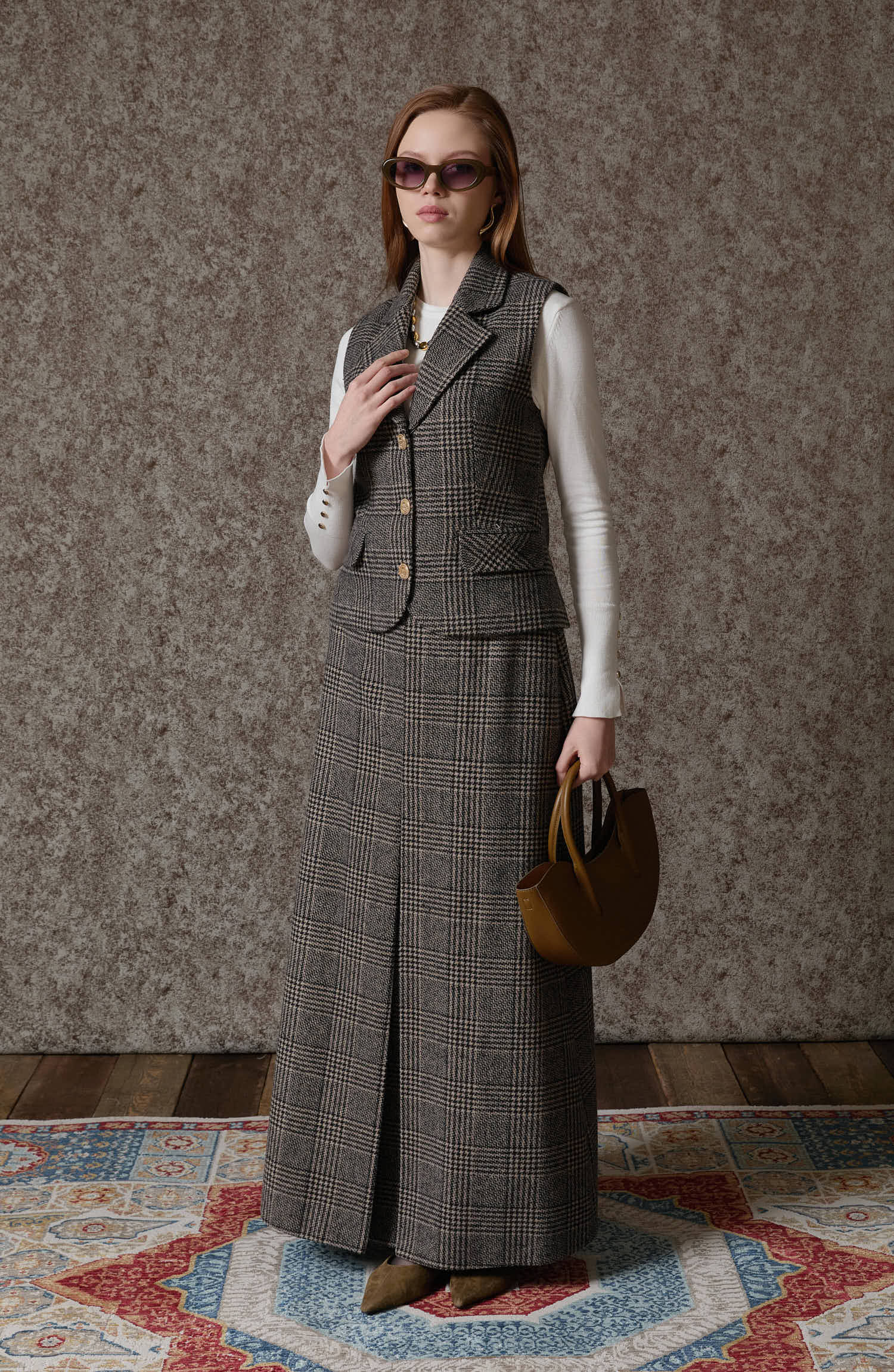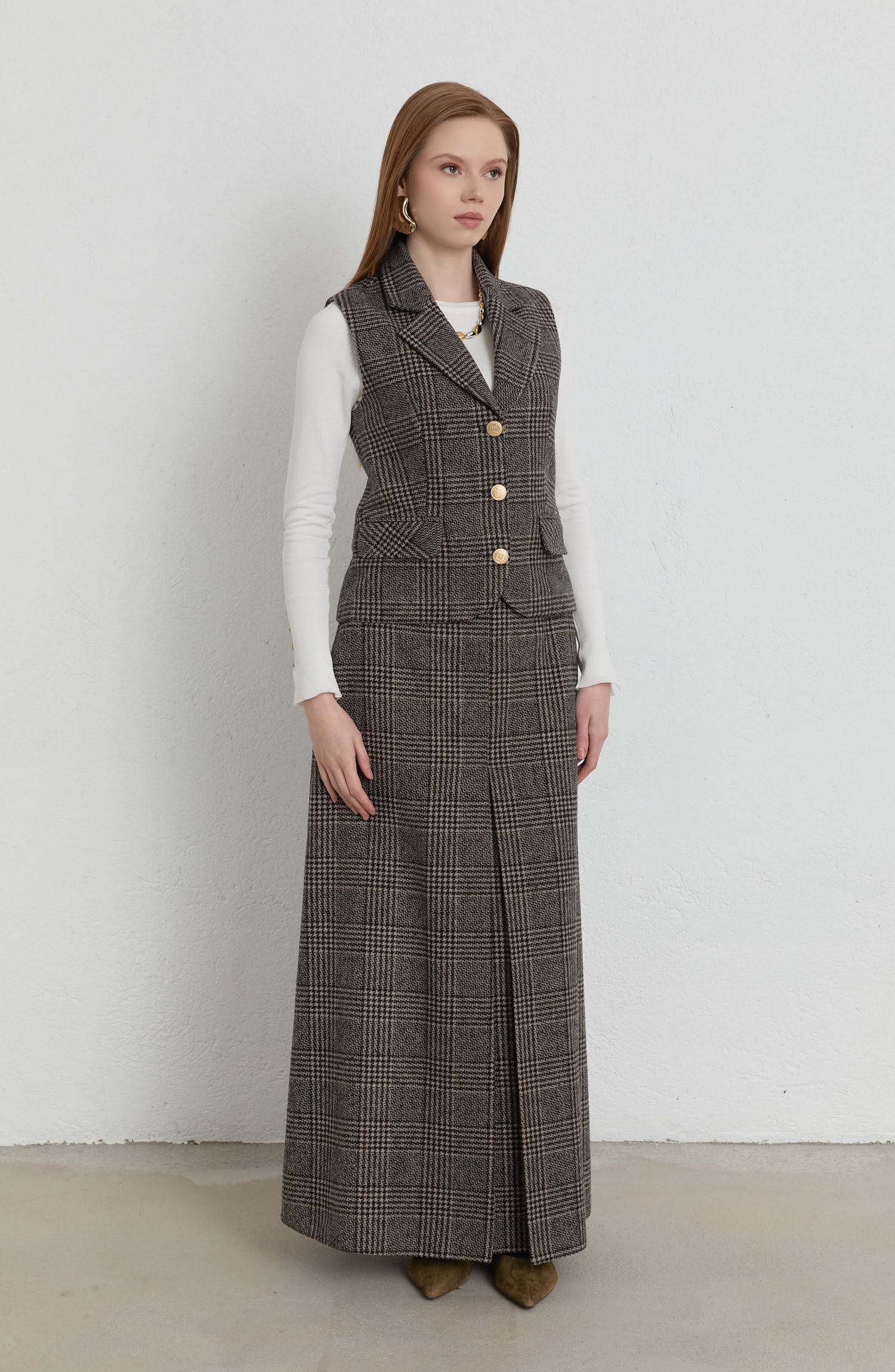 Ekose Kazayağı Blazer Vizon Yelek Etek Takım