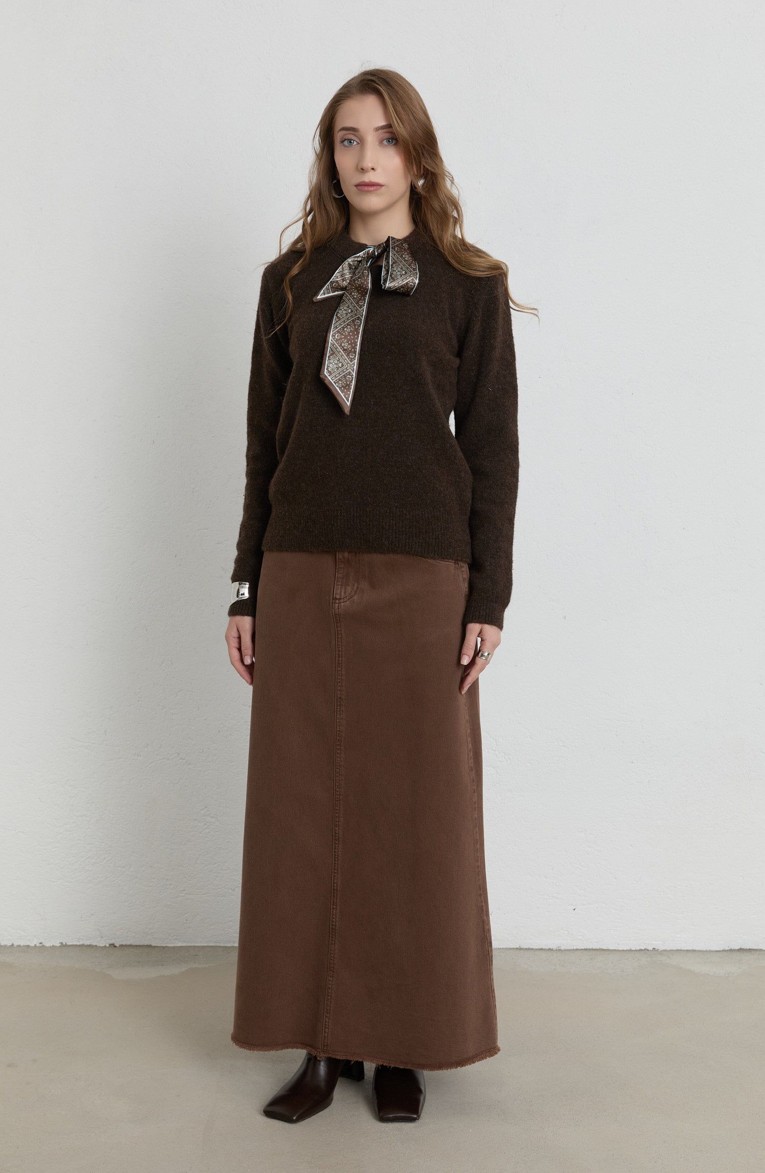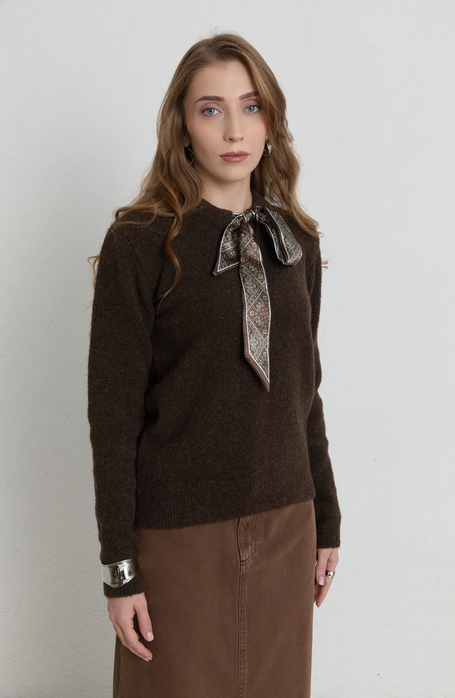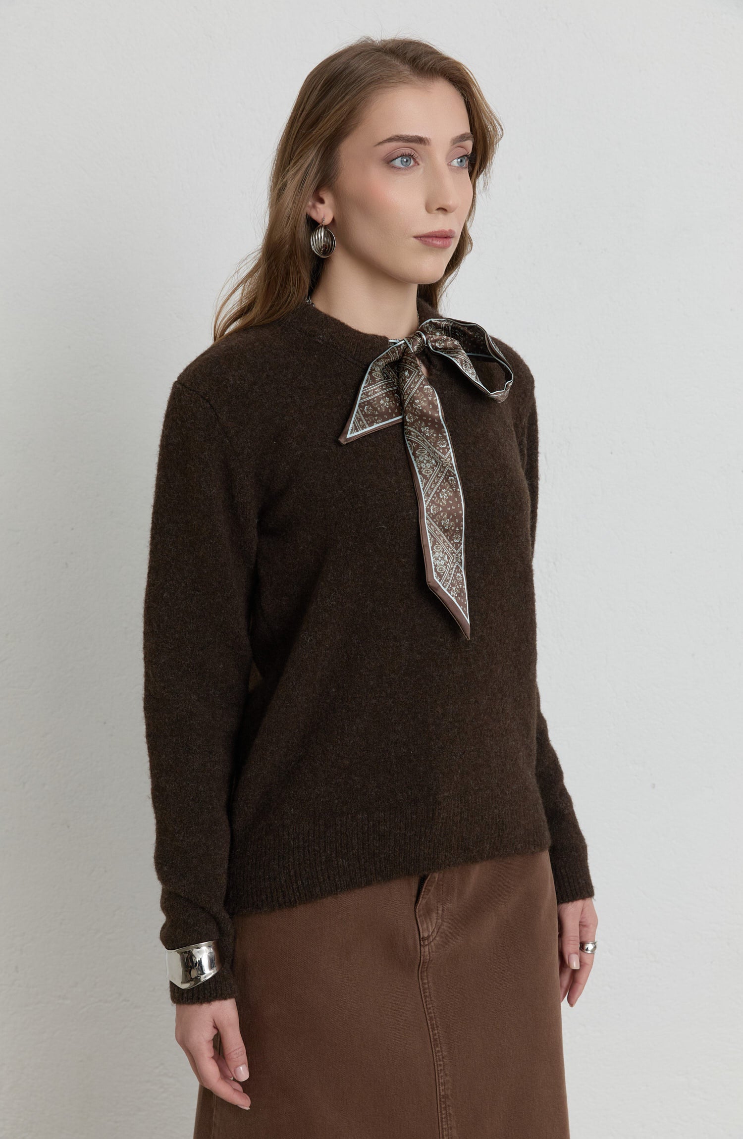Fularlı Acı Kahve Basic Yumoş Triko Kazak