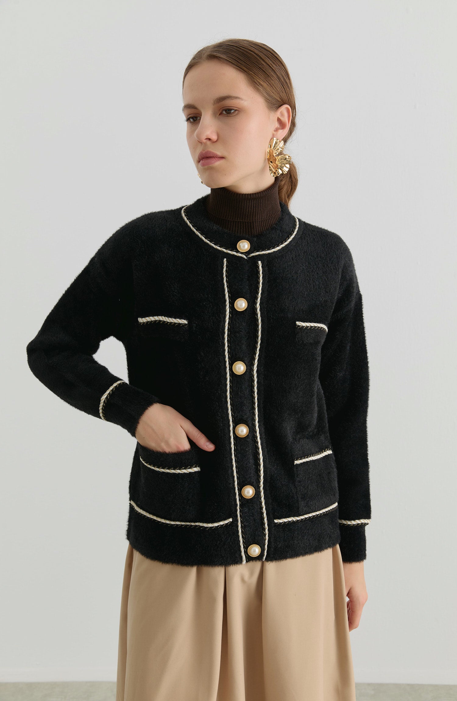 İnci Düğmeli Siyah Yumoş Triko Hırka