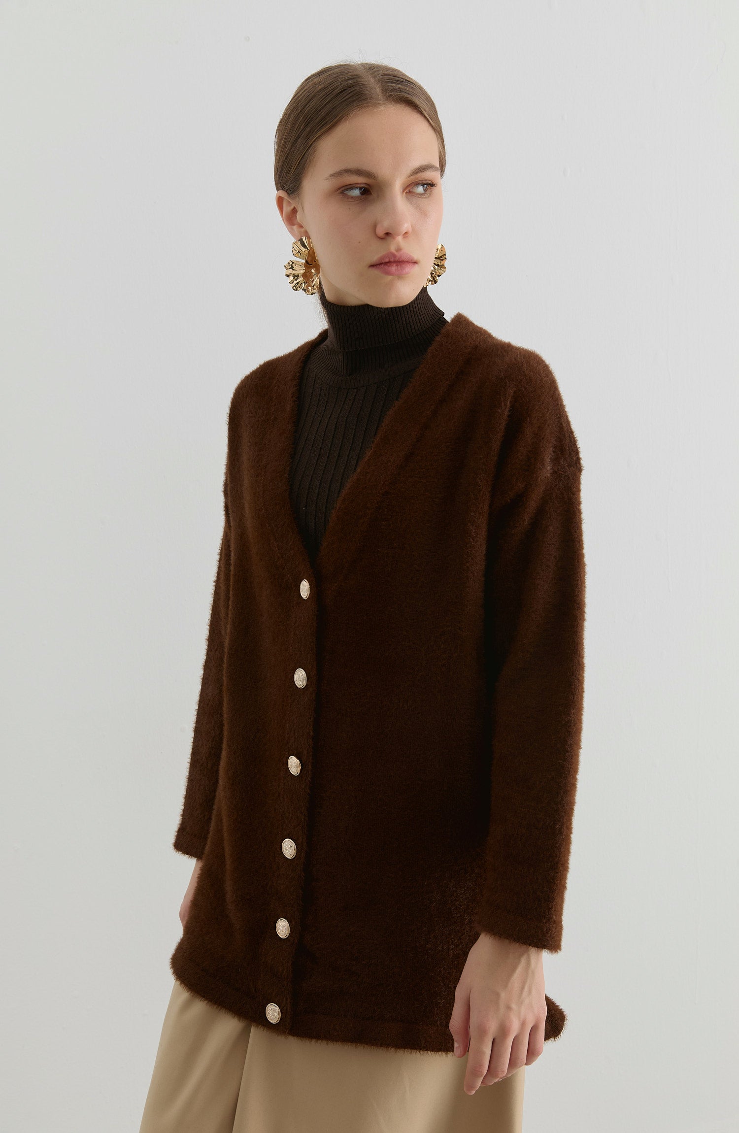 V Yaka Acı Kahve Yumoş Triko Hırka - Fatma Atasoy